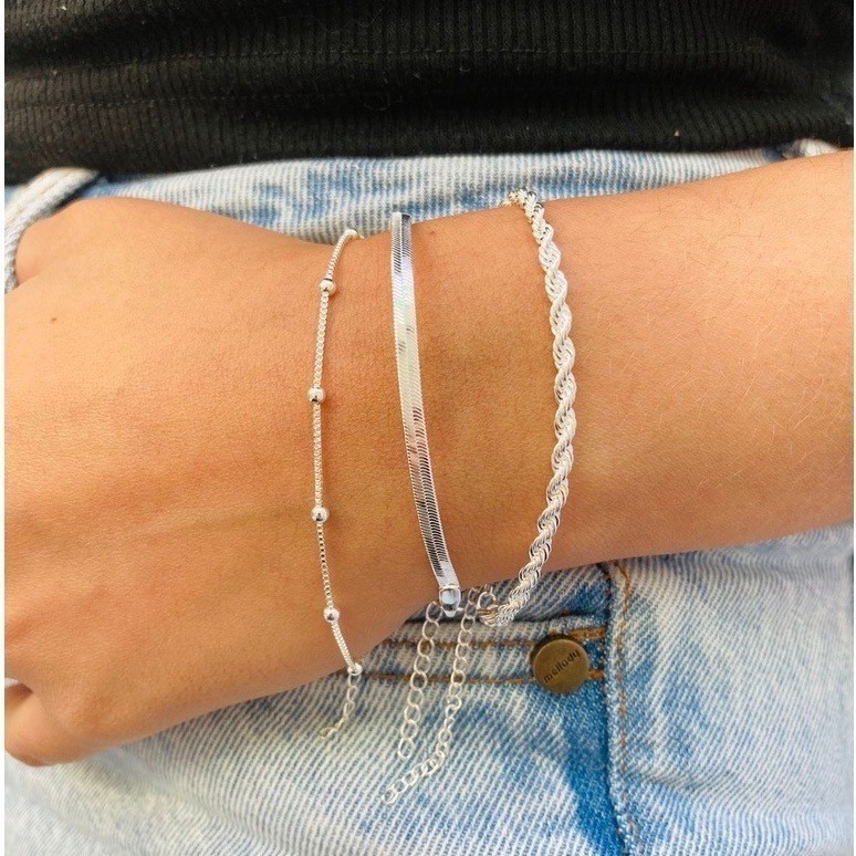 Kit 3 Pulseiras Prata 925 Folheada Cordão Baiano Fio Liso Metalizada Conjunto Pulseira Feminina de Bolinha