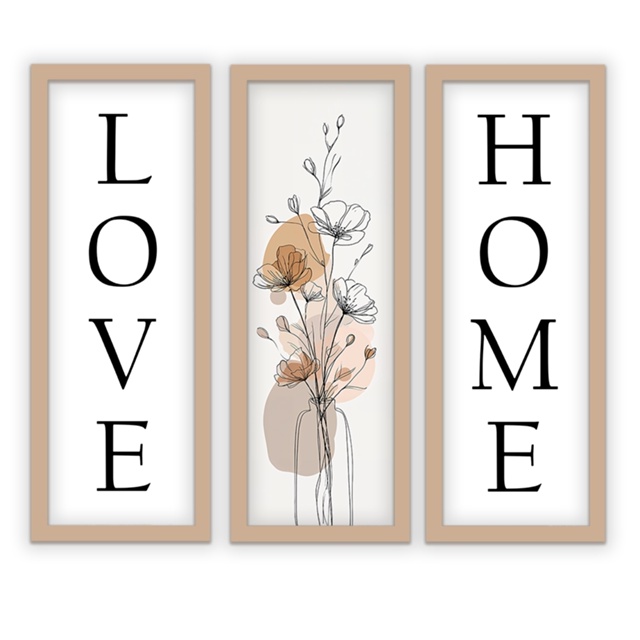 Kit 3 quadros 18x45 cm, sala, quarto, escritório, home love, moldura e vidro