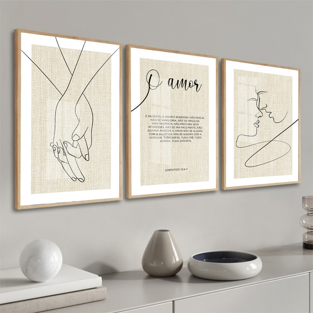 Kit 3 Quadros Casal Minimalista Neutro Moldura e Vidro Quarto
