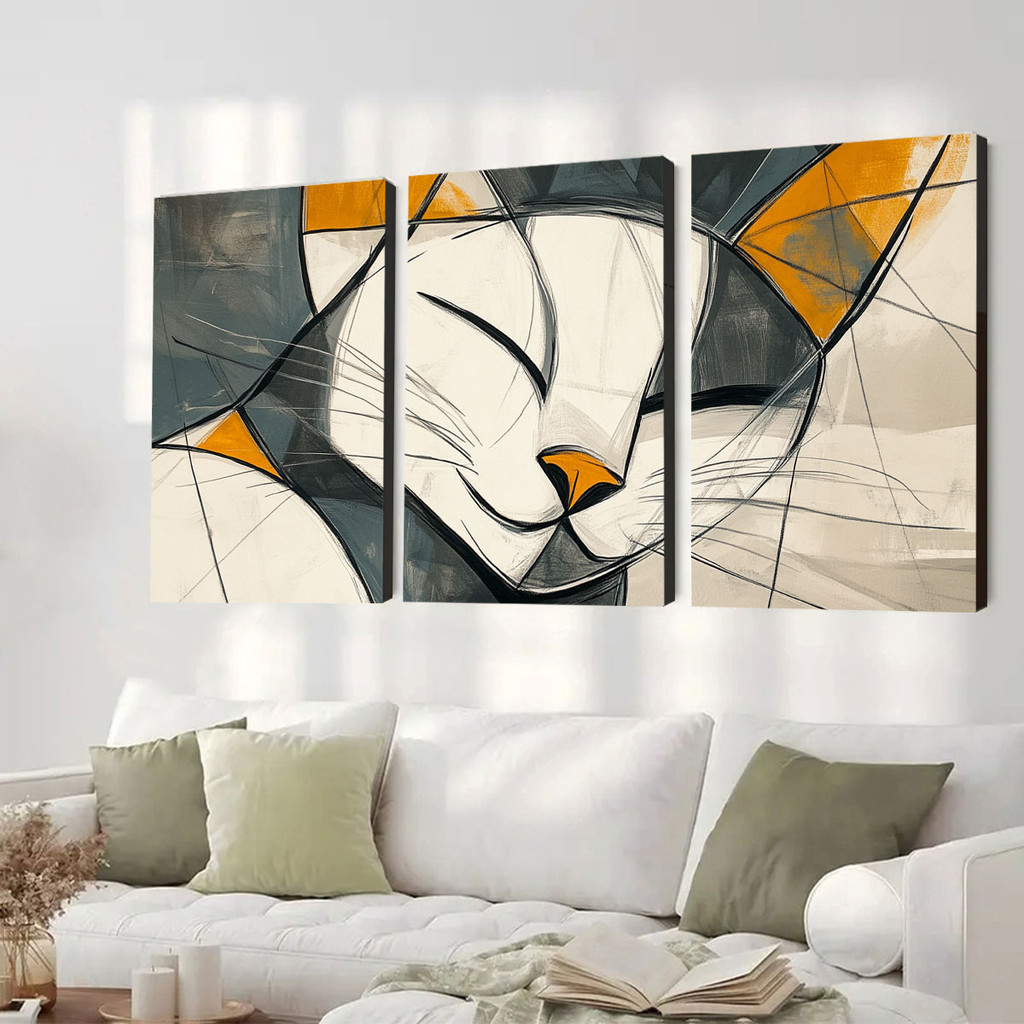 KIT 3 Quadros Decorativos Arte Abstrata Gato Sonhador Sala de Estar Quarto Decoração de Parede