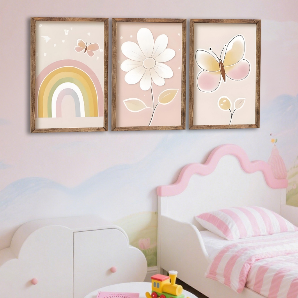 Kit 3 Quadros Decorativos De Quadros De Flores Borboletas E Arco íris Quarto Para Crianças