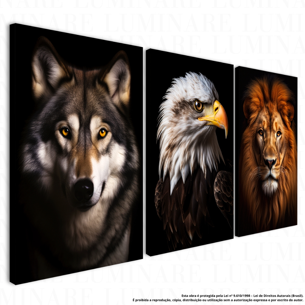 Kit 3 Quadros Decorativos em MDF com Impressão 8K – Lobo, Águia e Leão – Execução Foco Disciplina