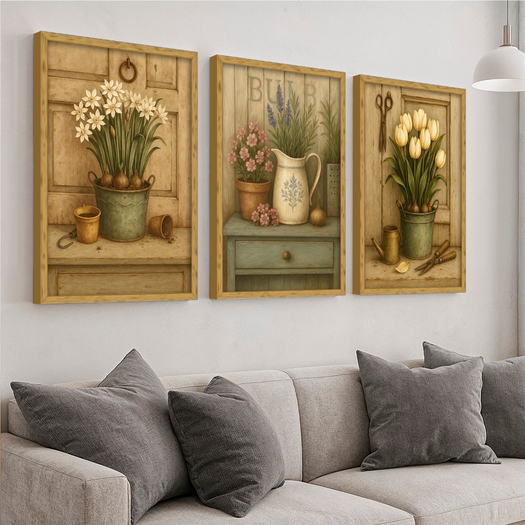 Kit 3 Quadros Decorativos Flores Rústico Vintage Vasos Cozinha Sala Quarto Parede Moderna