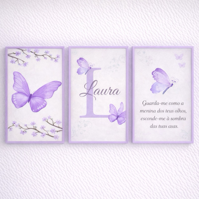 Kit 3 Quadros Decorativos Infantil Borboleta Lilás Personalizado Nome MDF