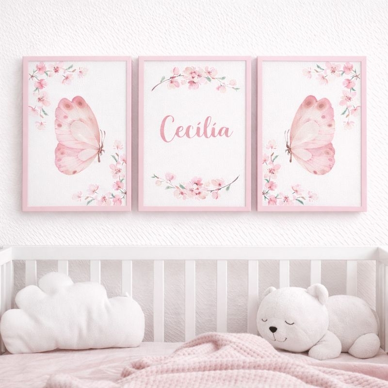 Kit 3 Quadros Decorativos Infantil Floral Rosa Com Nome Personalizado – Decoração Quarto Menina