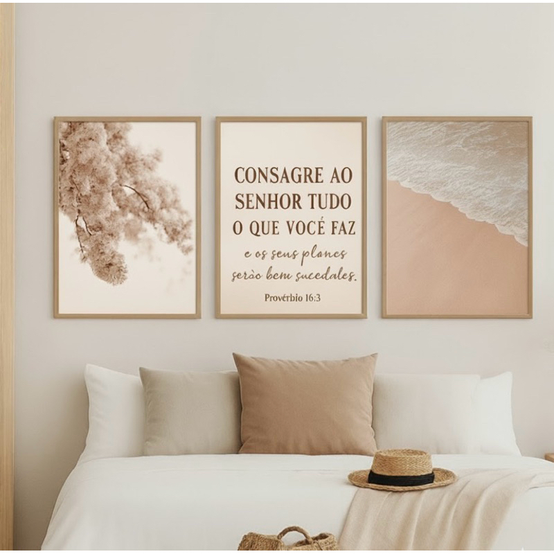 Kit 3 Quadros Decorativos Marrom e Bege Quarto Casal Sala Frase Bíblica Versículo Consagre ao Senhor