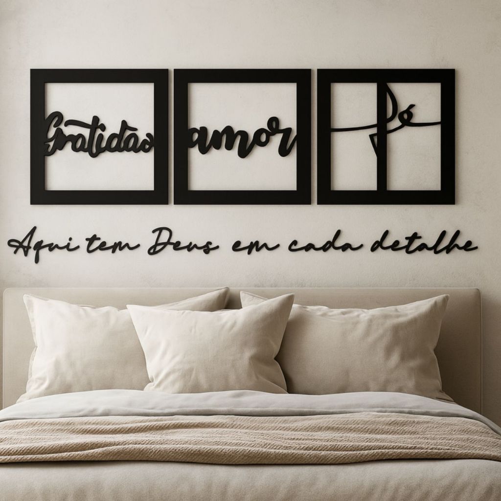 Somos a Refinart, facilitamos a transformação de qualquer ambiente, com peças que combinam modernidade, praticidade e muito estilo. Dê vida nova às suas paredes com nossos quadros vazados, esculturas e frases personalizadas. DETALHES: - Materia prima: Mdf ecológico - Cor:Tinta Preto Premium - Espessura: 3mm ITENS INCLUSOS: - Quadros Amor Fé Gratidão: ( 60cm de comprimento x 20cm de altura ) ( todos os quadros ) - Frase para todo sempre 2 cr reto P: ( 74cm de comprimento x 7cm de altura ) - Frase Aqui tem Deus em cada detalhe m2: ( 75cm de comprimento x 7cm de altura ) - Frase um dia tudo isso aqui já foi um sonho... realidade! P: ( 60cm de comprimento x 12cm de altura ) ( uma frase em baixo da outra ) (1,12cm de comprimento x 7cm de altura ) ( reto ) - Frase Abençoados por deus traços finos P: ( 80cm de comprimento x 10cm de altura ) - Frase Livrai me de todo mal amem! - ( 67cm de comprimento x 5cm de altura ) - Frase Deus é bom o tempo todo comprido P: ( 75cm de comprimento x 6cm de altura ) - Frase seja forte e corajosa comprido P: ( 72cm de comprimento x 9 cm de altura ) - Frase Por onde for quero ser seu par P: ( 75cm de comprimento x 8cm de altura ) - Frase Para nos todo amor do mundo embutido P: ( 76cm de comprimento x 7cm de altura ) - Frase Que a felicidade vire rotina traços finos P: (75cm de comprimento x 5cm de altura ) - Frase Tudo aqui ja foi um sonho diamante: ( 77cm de comprimento x 10cm de altura ) - Frase os sonhos não envelhecem comprido: ( 79cm de comprimento X 7cm de altura ) - FITA DUPLA FACE DICAS: - Para limpeza utilize apenas um pano seco, não utilize produtos químicos, para garantir a durabilidade. - É indicado aplicar as peças em parede que sejam lisas.