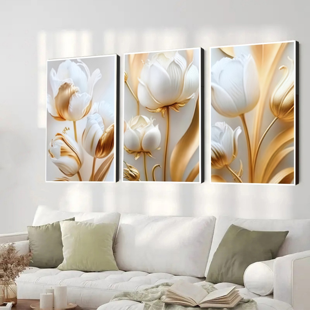 KIT 3 Quadros Decorativos Sala Flores Tulipas Brancas Gold Flor 4k 120*60CM