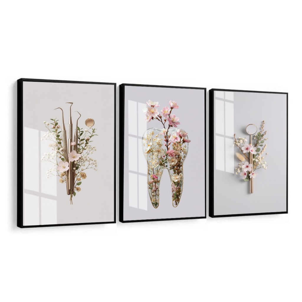 Kit 3 Quadros - Flores Odontologia Consultório Moldura e Vidro Sala Corredor