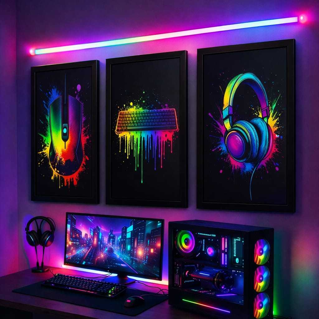Kit 3 Quadros Gamer Neon RGB Controle Game | Decoração Quarto Gamer Setup PC Gamer Colorido