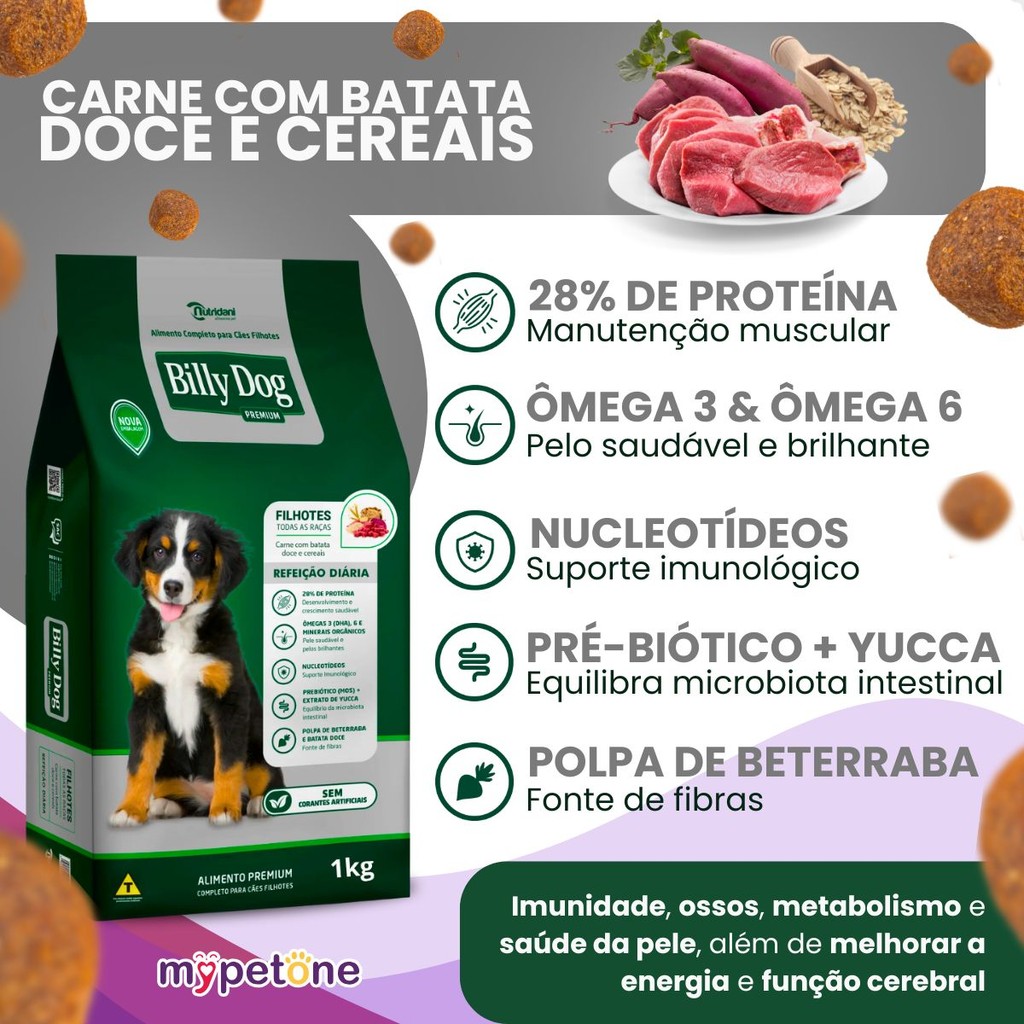 Kit 3 Ração Billy Dog 1Kg Cães Filhotes Refeição Diária