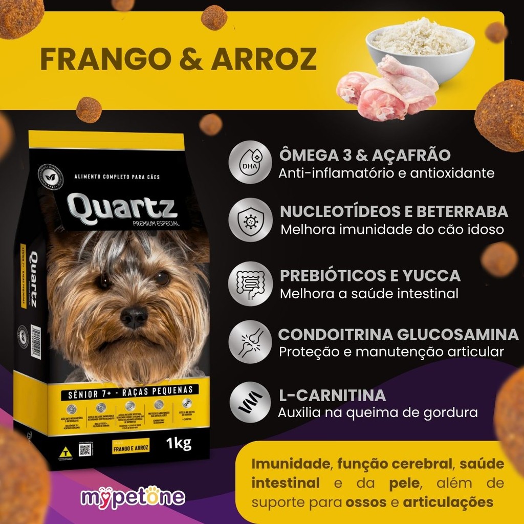 Quartz Sênior 7+ Raças Pequenas – Frango e Arroz O Quartz Sênior 7+ Raças Pequenas é uma ração premium especialmente desenvolvida para cães idosos (7 anos ou mais) de porte pequeno. Com 25% de proteína de alta qualidade, foi formulada para atender as necessidades nutricionais dessa fase da vida. Caracteristicas: - Proteína: 25% - Ingredientes funcionais: DHA (ômega‑3), cúrcuma (açafrão), nucleotídeos + polpa de beterraba, prebióticos, extrato de yucca, polpa de batata‑doce, ômega‑6, condroitina, glucosamina e L‑carnitina - Proteção articular: condroitina e glucosamina para suporte das articulações - Controle de peso: L‑carnitina auxilia na queima de gordura - Saúde intestinal: prebióticos + yucca reduzem o odor e o volume das fezes - Ação antioxidante: cúrcuma e ômega‑3 reduzem inflamações e protegem o organismo Beneficios: - Suporte à função cognitiva, cardíaca e saúde da pele e pelagem - Melhora do sistema imunológico e digestivo - Suavização da função articular e mobilidade - Controle de peso e composição corporal adequada Indicação de uso: - Cães sênior de porte pequeno, acima de 7 anos - Ideal como alimentação diária para manter vitalidade, saúde e bem-estar nesta fase da vida Quartz Sênior 7+ Raças Pequenas – Frango e Arroz: nutrição avançada e completa para dar mais qualidade de vida ao seu cão idoso.