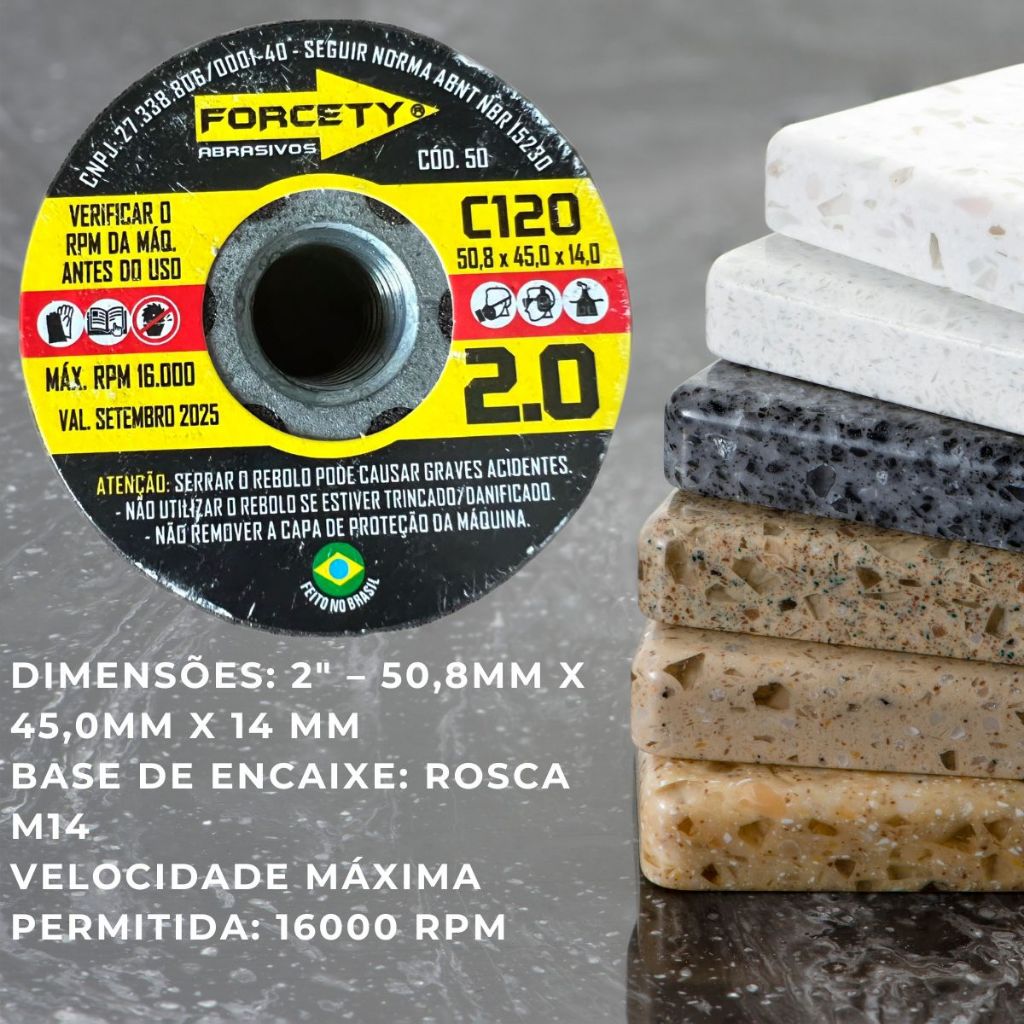 - Os rebolos são fabricados com objetivo de desbastar e polir mármores, granitos, granilites e concretos em geral. - São fabricados em diversos diâmetros e espessuras. Cada um dos grãos é realmente uma ferramenta de corte afiada. Em conjunto, executam o trabalho de acabamento do material. - Utilizados para boleamento e acabamento de mármores e granitos e porcelanato. - Para trabalho a seco ou refrigerado com água. REBOLOS DISPONÍVEIS: #36 - Desbaste Inicial #60 - Desbaste Intermediário #80 - Desbaste Final #120 - Pré Polimento - Dimensões: 2" – 50,8mm X 45,0mm X 14 mm - Base de encaixe: Rosca M14 - Liga: Carboneto de Silício Preto - Velocidade máxima permitida: 16000 RPM
