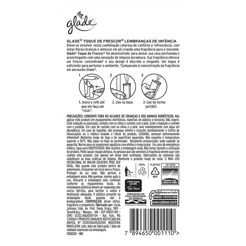 Kit 3 Refil Odorizador Glade Toque de Frescor 12ml * Kit Contém: 3 Refís Odorizador de Ambiente Glade Lembranças de Infância Toque de Frescor 12ml cada * Compre Produtos Glade