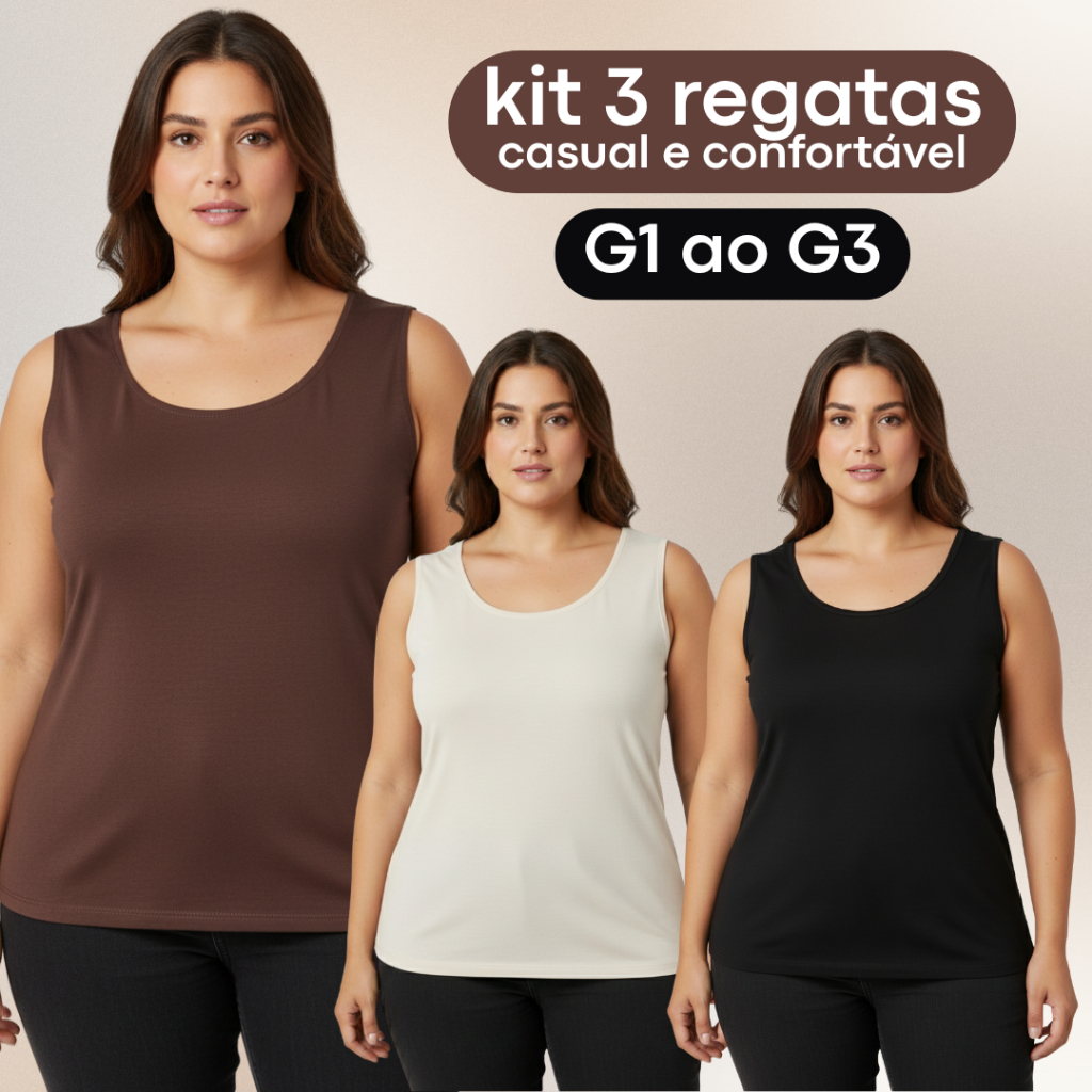 Kit 3 Regatas Plus Size Feminina Alça Larga Viscolycra Elástico Confortável Verão G1 G2 G3