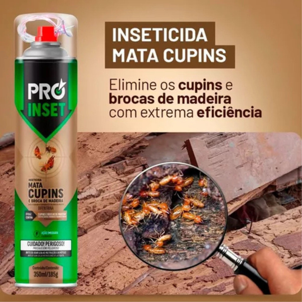 MATA CUPIM 350ML PROINSET 3 UNIDADES Elimine cupins e brocas de madeira de forma efetiva com o Mata Cupins Pro Inset. Inseticida à base de solvente especialmente criado para combater esses insetos que se instalam em peças de madeira. Com ação imediata e aplicador específico para o uso. Uso doméstico. CARACTERÍSTICAS - Ação imediata; - Fácil aplicação; - Seu ambiente protegido; - Contra cupins e brocas de madeira. MODO DE USO Agite bem antes de usar. Para usar o Mata Cupim Pro Inset basta retirar a tampa e colocar a agulha injetora nos pequenos orifícios da madeira, pressionando a válvula até saturar o orifício. Faça isso em todos os orifícios encontrados na madeira. Se necessário, aumente o diâmetro do orifício com um prego para que a agulha possa penetrar livremente, podendo o inseticida aparecer em algum outro ponto da madeira. Caso os orifícios estejam vedados pelos próprios cupins com suas substâncias, remova esta vedação antes de aplicar o produto, para evitar entupimento ou quebra da agulha. Inspecione periodicamente em alguns meses para assegurar-se da eliminação da colônia.