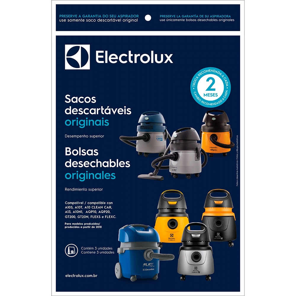 COMPATÍVEL SOMENTE COM ASPIRADORES FABRICADOS APÓS 2010. Os sacos descartáveis originais Electrolux são biodegradáveis e não agridem o ambiente. São higiênicos e desenvolvidos com 2 níveis de filtragem, que evita que a poeira escape e danifique o motor. Fácil de instalar e de descartar. O único que garante a qualidade Electrolux na sua casa. Conteúdo da embalagem: 3 Sacos descartáveis para aspirador de pó Electrolux. Marca: Electrolux. Modelo: CSE10. Bocal duplo com diâmetros de 4,5cm e 6,5cm. Modelos Compativeis (Para aspiradores fabricados DEPOIS de 2010): A10S (A10 Smart) A10T (A10 Turbo) A10 CLEAN CAR A13 A10N1 AQP10 (Acqua Power 10) AQP20 (Acqua Power 20) GT2000 / GT20N / GT20P FLEXS / FLEXC / FLEXN AWD01 (Hidrolux) PRODUTO ORIGINAL ELECTROLUX.