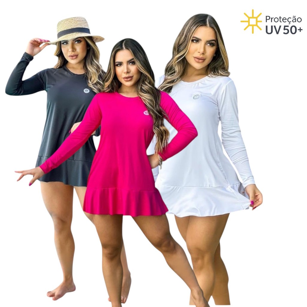 --- KIT COM 3 VESTIDO SORTIDOS --- Vestido Saída de praia com proteção solar UV50+, ideal para curtir o verão com segurança e conforto. Confeccionado em tecido de microfibra de poliéster e elastano, oferece toque leve, elasticidade e excelente caimento. Composição: 90% poliéster e 10% elastano. ** Preferência de cor enviar em mensagem para o vendedor antes de concluir o pagamento ** Medidas Aproximadas: P: Altura 76 cm | Largura 44 cm | Manga 54 cm M: Altura 78 cm | Largura 48 cm | Manga 56 cm G: Altura 80 cm | Largura 50 cm | Manga 58 cm GG: Altura 82 cm | Largura 52 cm | Manga 60 cm Perfeito para praia, piscina ou passeios ao ar livre, garantindo proteção e estilo em todos os momentos.