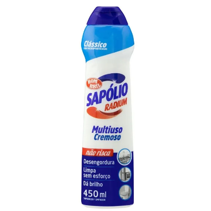 Kit com 3 unidades Sapólio Radium Cremoso Clássico 450ml Fragrância: Clássico Modo de uso: Aplique o produto com pano macio e úmido ou com o lado macio da esponja e esfregue.Depois, remova-o completamente. Conservação: Mantenha o produto em sua embalagem original. Sapólio Radium Cremoso limpa e renova o brilho sem riscar. Ideal para limpar superfícies esmaltadas, cromadas, fórmicas, panelas e muitas outras. Sapólio, Sapólio Cremoso, Bombril. Dá brilho.Não risca.Limpa.