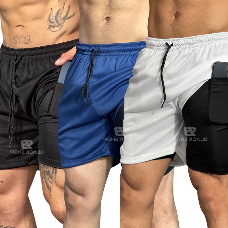 KIT 3 Short RUN 2 em 1 Bermuda Elastano Academia Masculino Treino Corrida