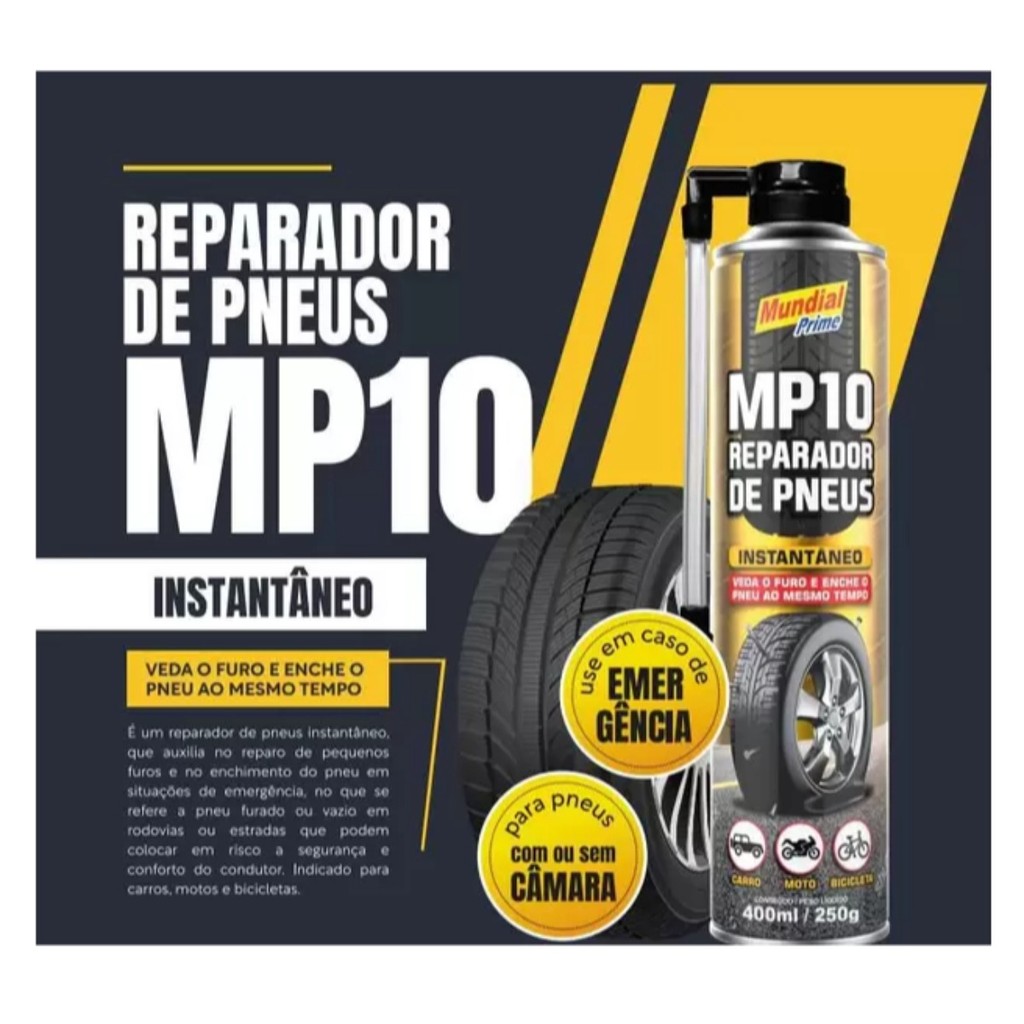 🚗 KIT COM 3 SPRAYS REPARADORES DE PNEUS INSTANTÂNEOS – 400ML / 250G CADA O Reparador de Pneus Instantâneo é a solução rápida, prática e segura para vedar furos e inflar pneus em segundos, sem precisar de ferramentas ou desmontagem. Ideal para carros, motos e bicicletas, o produto é compatível com pneus com ou sem câmara, garantindo mobilidade e segurança imediata em situações de emergência. 🔧 APLICAÇÕES Repara furos e infla o pneu imediatamente, sem remover ou desmontar. Indicado para carros de passeio, motos, scooters e bicicletas. Compatível com pneus com e sem câmara. ⚙️ DESEMPENHO Fórmula à base de látex, não danifica pneus, câmaras nem válvulas. Cria uma vedação interna que mantém a pressão por centenas de quilômetros até o reparo definitivo. Recipiente resistente a impacto, ideal para manter no porta-malas, baú ou mochila. 🧰 MODO DE USAR (PASSO A PASSO) Se possível, remova o objeto que causou o furo. Posicione a válvula do pneu para cima. Agite bem o frasco. Em dias frios, aqueça-o entre as mãos ou próximo ao motor desligado. Limpe a válvula e conecte o aplicador do produto. Pressione o spray até que o pneu esteja cheio novamente. Dirija por cerca de 5 km em baixa velocidade para o produto se distribuir internamente. Calibre o pneu assim que possível e realize o reparo definitivo posteriormente. 📦 CONTEÚDO DA EMBALAGEM 3x Sprays Reparadores de Pneus Instantâneos – 400ml / 250g cada 💡 BENEFÍCIOS Repara e infla pneus em segundos Seguro para pneus com ou sem câmara Não agride válvulas nem borrachas Ideal para emergências Fácil de aplicar, sem ferramentas Storm Auto Parts – Praticidade, segurança e qualidade em cada quilômetro. ⚙️💪