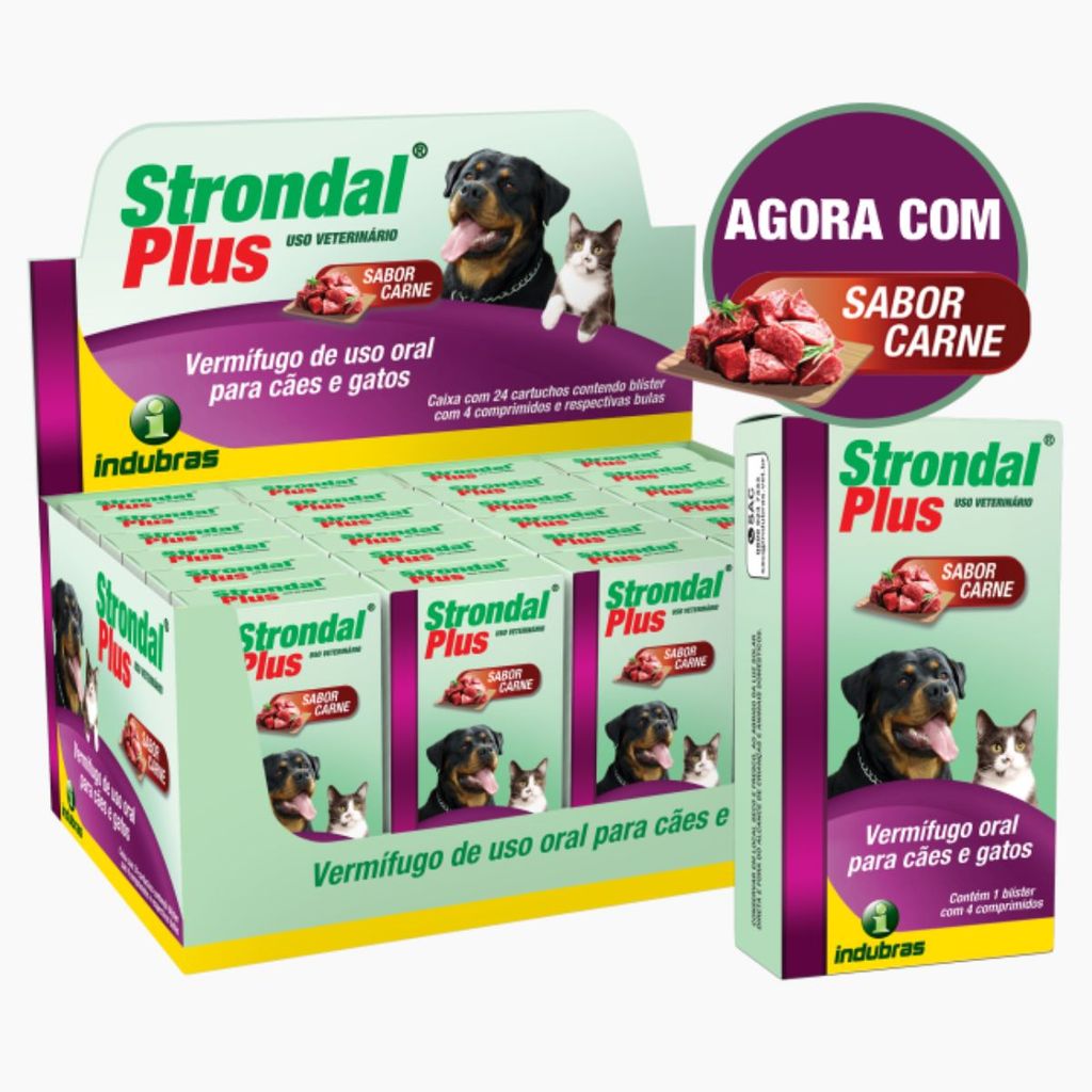 Kit 3 Strondal Plus Carne Vermífugo 4 Comprimidos Cães/Gatos