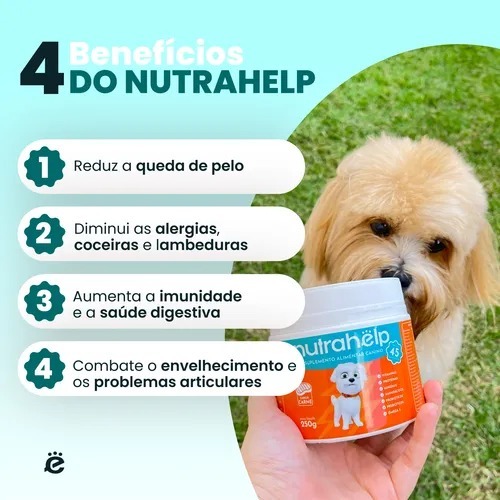 NutraHelp é o suplemento canino completo, desenvolvido para oferecer mais de 45 nutrientes essenciais em uma única fórmula. Rico em vitaminas, minerais, aminoácidos, proteínas, ômega 3, pré e probióticos, ele promove saúde, vitalidade e imunidade geral do seu cão. Com sabor de carne natural, NutraHelp pode ser facilmente adicionado a qualquer alimento, garantindo que seu pet receba todos os nutrientes que a ração sozinha não fornece. Ideal para cães de todas as raças, tamanhos e fases da vida, é a escolha dos tutores que buscam qualidade de vida e longevidade para seus amigos de quatro patas. Principais Benefícios: - Reduz a queda de pelo e aumenta o brilho da pelagem; - Diminui alergias, coceiras e lambeduras; - Fortalece a imunidade e melhora a saúde digestiva; - Combate os efeitos do envelhecimento e problemas articulares; - Regula níveis de energia e apetite; - Controla estresse e ansiedade. Por que suplementar? Mesmo a melhor ração pode não fornecer todos os nutrientes essenciais para a saúde do seu cão. NutraHelp foi formulado para preencher essas lacunas nutricionais, prevenindo doenças e promovendo bem-estar completo. Com mais de 87 mil pets beneficiados, é aprovado por veterinários e especialistas e oferece praticidade, economia e sabor que os cães adoram. Ficha Técnica: - Tipo de produto: Suplemento canino 8 em 1; - Nutrientes: Vitaminas, Minerais, Aminoácidos, Proteínas, Ômega 3, Pré e Probióticos (mais de 45 nutrientes); - Indicação: Cães de todas as raças, tamanhos e idades; - Rendimento: Até 125 doses; - Sabor: Carne natural, aprovado pelos pets mais exigentes; - Modo de uso: Adicionar 1 vez ao dia na comida do cão; - Garantia: Resultados visíveis em 30 dias ou dinheiro de volta. NutraHelp é a solução completa para cães saudáveis, ativos e felizes. Experimente sem compromisso e veja a transformação na saúde do seu pet. Satisfação garantida ou 100% do valor devolvido.