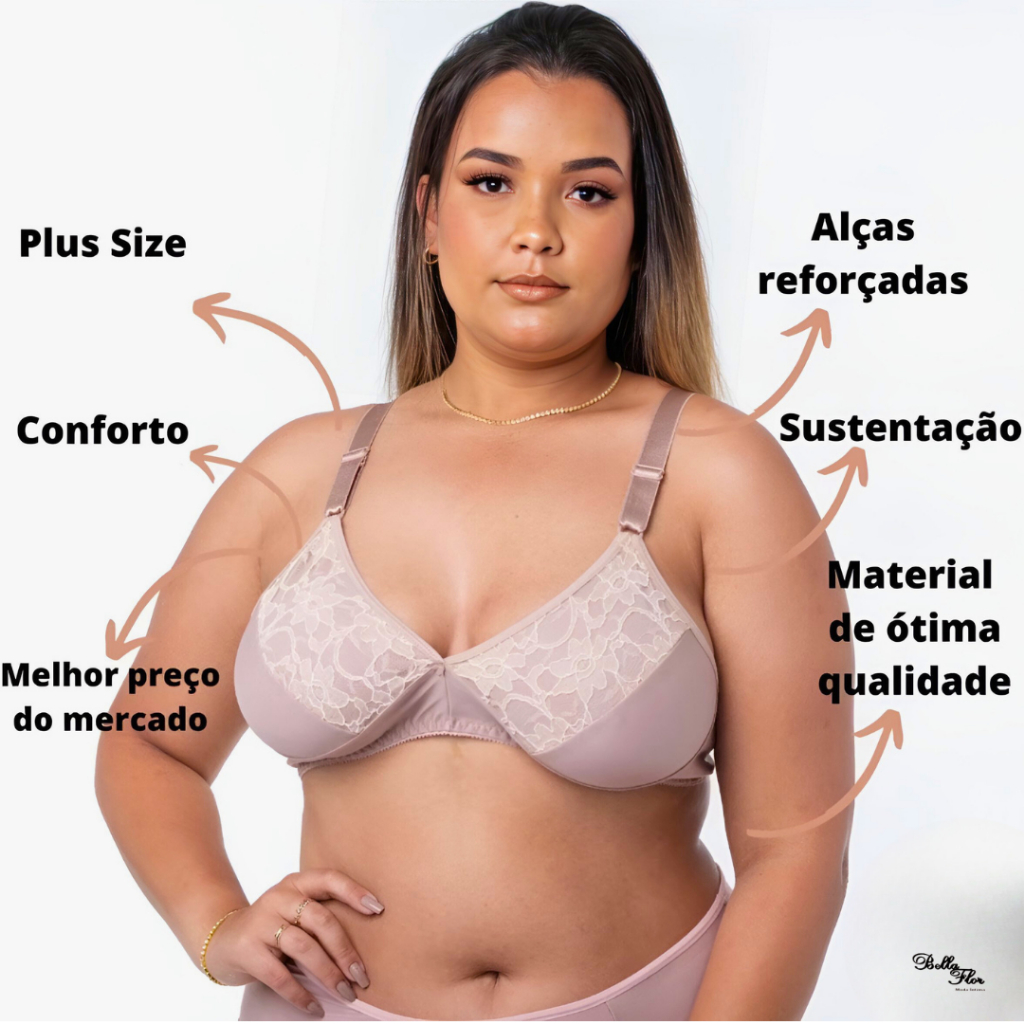Somos a Bella Flor Oficial, trabalhamos com o foco de levar beleza e conforto nos nossos produtos, com qualidade e o melhor preço do mercado! Nosso sutiã plus size é confeccionado em lycra grossa de alta resistência, proporcionando excelente sustentação e durabilidade. Suas alças reforçadas são especialmente projetadas para oferecer maior suporte e conforto, ideal para o uso diário. Com um design que valoriza as curvas, ele garante segurança e estabilidade sem comprometer o estilo. Perfeito para quem busca um sutiã robusto e confortável para o dia a dia Tecido: Lycra grossa e resistente, que oferece firmeza e durabilidade. Suporte: Alta sustentação, ideal para quem precisa de suporte extra. Alças reforçadas: Largas e ajustáveis, proporcionando conforto e distribuindo o peso de maneira uniforme. Aro: Sem aro. Laterais: Laterais largas e firmes, garantindo um ajuste seguro e confortável. Fecho: Fecho traseiro ajustável com múltiplas opções de encaixe para melhor adaptação ao corpo. Design: Desenvolvido para atender às necessidades do corpo plus size, unindo conforto e suporte sem sacrificar o estilo. Referência de medidas: M - (42 ao 44) 100 cm até 104cm G - (46 ao 50) 105cm até 110cm GG - (50 ao 52) 111cm até 116cm EG -(54 ao 56) 117cm até 128cm (modelo veste GG) COMPOSIÇÃO 83% Poliamida 17% Elastano