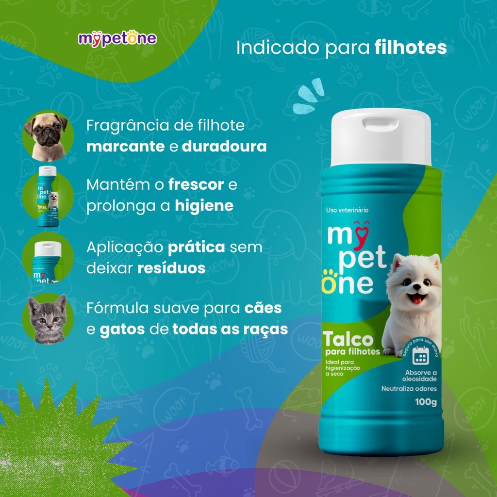Talco Filhote My Pet One – 100g Higiene suave e proteção delicada para os primeiros cuidados do seu cãozinho. O Talco Filhote My Pet One foi desenvolvido especialmente para filhotes de todas as raças, oferecendo uma fragrância leve e agradável com ação desodorizante. Ideal para manter seu pet limpo, perfumado e confortável entre os banhos, com uma fórmula pensada para a pele sensível dos mais novinhos. Benefícios: - Indicado para filhotes de cães de todas as raças. - Perfuma suavemente e combate maus odores. - Fácil de aplicar: toque seco e agradável. - Ajuda a manter a pelagem limpa entre os banhos. - Uso seguro a partir de 90 dias de vida. Modo de Uso: Deposite uma pequena porção do produto sobre as palmas das mãos e espalhe de forma uniforme sobre a pelagem do pet, evitando a região dos olhos, focinho e genitais. Pode ser usado diariamente ou sempre que necessário para manter a higiene e o perfume do animal. Especificações Técnicas: - Apresentação: Talco em pó - Peso: 100g - Indicação: Filhotes de cães de todas as raças - Idade: A partir de 90 dias My Pet One – Cuidar é demonstrar amor todos os dias.