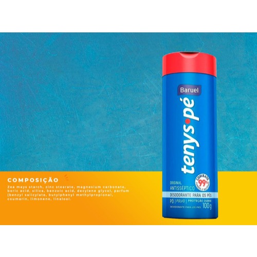 ENVIO IMEDIATO Kit com 3 unidades Tenys Pé Baruel Talco desodorante antisséptico para os pés. Tenys Pé Baruel protege os pés contra os odores da transpiração com fragrância fresca. O Talco Desodorante Tenys Pé Baruel conta com ação antisséptica e controla a transpiração dos pés, mantendo-os sempre secos e protegidos E o melhor, não deixa resíduos brancos e visíveis. Além disso, combate 99% de fungos e bactérias e elimina o mau odor. MODO DE USAR: Aplique diariamente o produto nos pés. Pela manhã ou à noite. Pode ser aplicado também dentro do tênis ou calçado como proteção auxiliar. E também antes e depois de atividades esportivas. BENEFÍCIOS: Antisséptico Controla a transpiração Elimina o mau odor Proteção 24h Absorção imediata Não deixa resíduos DERMALÓGICAMENTE TESTADO.