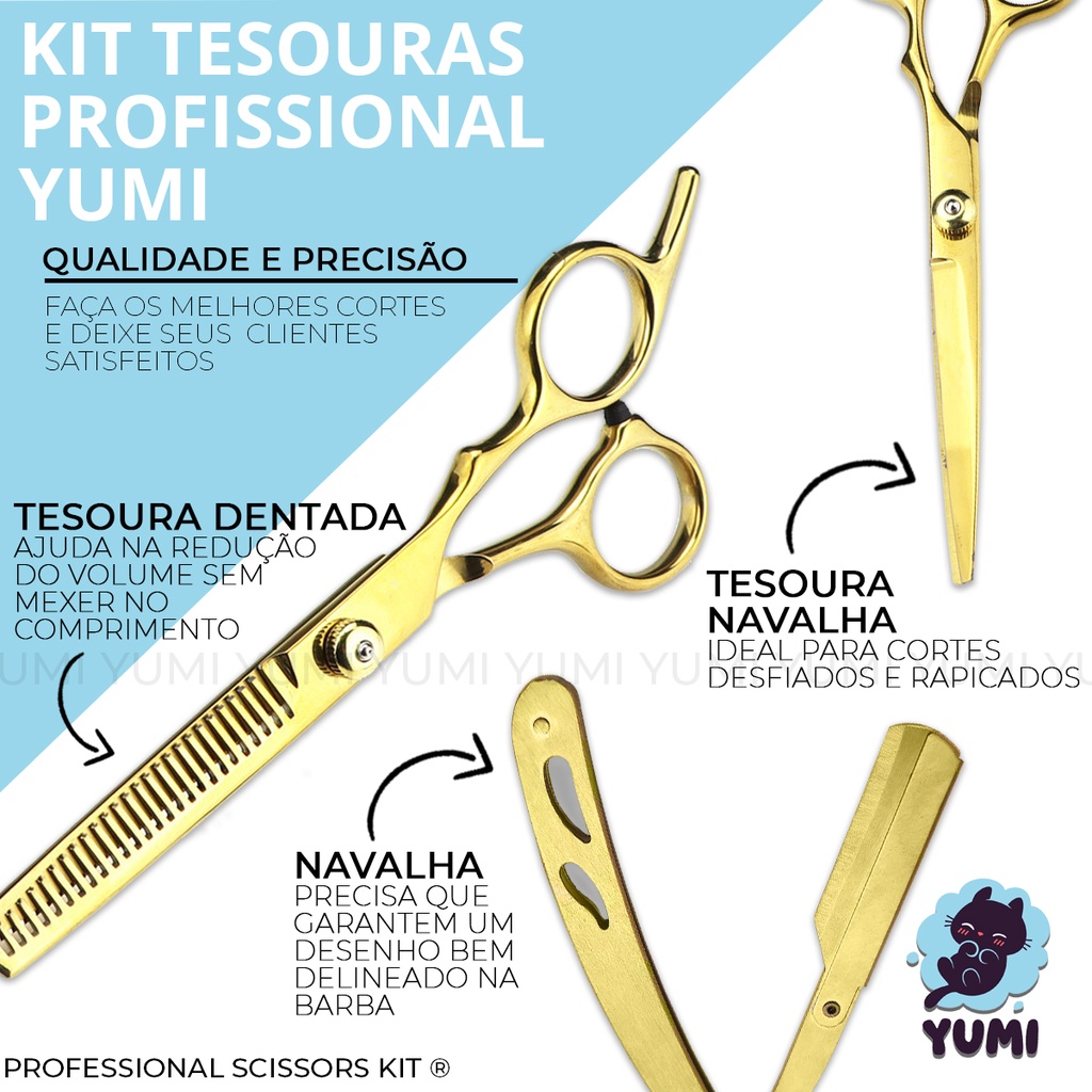 COMPRANDO HOJE ATÉ AS 12HRS (MEIO-DIA) ENVIAMOS NO MESMO DIA*. Kit de tesouras profissionais para os mais variados tipos de corte. Com produtos em aço inox que podem ser esterilizados e formato anatômico para conforto do profissional. A Tesoura Scissors Set Yumi é produzida com os mais altos padrões de qualidade. As Tesouras são fabricadas de acordo com os rígidos padrões de qualidade, usando aço inoxidável altamente resistente à corrosão. • Extremamente afiadas, corte MUITO preciso; • Feitas exclusivas para barbeiros e cabeleireiras; • Design Ergonômico e extremamente suave; • Adequadas para cabelos secos e molhados; • Com fiação polida em ambos os lados, o que dá boas propriedades de resistência; • Aço especial inoxidável; • Tesouras de altíssima qualidade! Scissors Set Yumi é versátil, funcional e ergonômica, uma marca que acredita na performance como expressão do seu talento. Contém Scissors Set Yumi Tesoura Inox Fio Navalha - 6": tesoura profissional de lâminas afiadas tipo navalha com 6", ideal para cortes desfiados. Feita em Aço Inox que pode ser esterilizado. Possui apoio para o dedo fixo conferindo conforto e segurança ao usuário e promovendo cortes desestruturados, desfiados e modernos. Scissors Set Yumi - 6": tesoura profissional lâmina laser tamanho 6", ideal para cortes retos. Lâmina micro serrilhada, feita em Aço Inox que pode ser esterilizado. Possui formato anatômico e conta com apoio para o dedo dando maior conforto e segurança ao corte. Scissors Set Yumi Desbaste - 6": tesoura lâmina de desbaste tamanho 6", ideal para retirar o volume dos fios em cortes texturizados. Lâmina dentada, feita em Aço Inox que pode ser esterilizado. Possui formato anatômico e apoio destacável para o dedo conferindo maior conforto e segurança ao corte. Sobre o Envio: -*Pedidos com pagamento aprovado até às 12 horas (meio-dia) serão enviados no mesmo dia, exceto aos finais de semana, feriados e emendas de feriados. -Pedidos com o pagamento for aprovado após as 12 horas (meio-dia), finais de semana, feriados e emendas de feriados serão enviados em até 1 dia útil. -IMPORTANTE: (Sempre confira com atenção seu endereço e CEP). -* O prazo de entrega é estimado, podendo variar em caso de acontecimentos imprevisíveis, bem como Greve dos Correios.