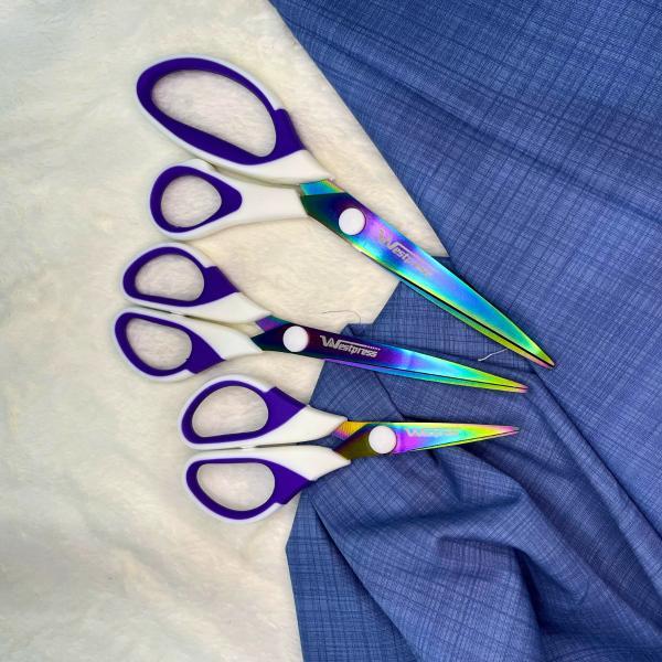 KIT 3 TESOURAS COM LÂMINA DE TITÂNIO PARA USO GERAL - COSTURA - PATCHWORK - Cabo Emborrachado em formato Ergonômico - Lâminas Banhadas em Titânio - Alto Padrão de qualidade. - Não Enferruja ou Oxida. - Usada em Tecidos, Papel, EVA entre outros. ITENS INCLUSOS 1 Tesoura de titânio 8,5" polegadas (21,5 cm) 1 Tesoura de titânio 7" polegadas (17,8cm) 1 Tesoura titânio bordado 5,5" polegadas (14 cm)