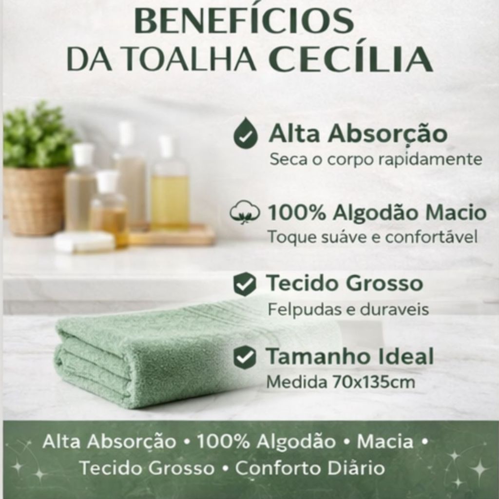 🛁 Kit 3 Toalhas de Banho Cecília 70x135 cm 100% Algodão – Maciez e Absorção para o Dia a Dia O Kit 3 Toalhas de Banho Cecília 70x135 cm 100% Algodão é ideal para quem busca conforto, alta absorção e praticidade na rotina diária. Desenvolvidas para proporcionar uma experiência agradável após o banho, as toalhas possuem toque macio e ajudam a secar o corpo com eficiência, trazendo mais conforto e bem-estar. Seu tecido felpudo em 100% algodão oferece sensação suave na pele e excelente capacidade de absorção. O tamanho padrão de banho garante cobertura adequada, enquanto o acabamento reforçado contribui para maior durabilidade mesmo após diversas lavagens. Além de práticas, as toalhas Cecília possuem visual elegante que combina facilmente com diferentes estilos de banheiro, sendo uma ótima opção para uso diário ou para compor kits de enxoval. ✨ Diferenciais das Toalhas Cecília Produzidas para unir conforto e funcionalidade, as toalhas oferecem o equilíbrio ideal entre maciez e absorção. O tecido felpudo auxilia na secagem eficiente do corpo, enquanto o algodão proporciona toque agradável e respirável para a pele. O modelo também conta com estrutura leve e resistente, facilitando o uso no dia a dia e garantindo praticidade na lavagem. 📏 Informações Técnicas ✔ Produto: Kit 3 Toalhas de Banho Cecília ✔ Quantidade: 3 unidades ✔ Medidas: 70 cm x 135 cm ✔ Peso aproximado: 260 g cada ✔ Composição: 100% Algodão ✔ Tecido: Felpudo macio e absorvente ✔ Indicado para: Uso diário 🌟 Benefícios do Produto Alta absorção de água Toque macio e confortável Secagem eficiente após o banho Tecido resistente e durável Ideal para uso diário 🏡 Onde Usar Banheiro residencial Kits de enxoval Pousadas e hotéis Academias Viagens ou casa de praia 💎 Por que escolher a Toalha Cecília A Toalha de Banho Cecília foi desenvolvida para oferecer conforto, absorção e praticidade no dia a dia. Seu tecido em algodão proporciona sensação agradável na pele, enquanto o tamanho ideal garante mais conforto após o banho. O kit com 3 unidades traz ainda mais praticidade para a rotina da casa, permitindo ter sempre toalhas disponíveis e facilitando a organização do enxoval. É uma excelente escolha para quem busca qualidade, economia e conforto.