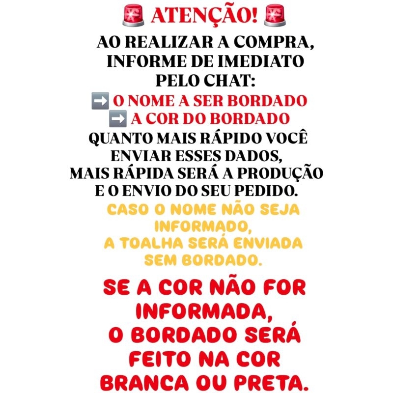 🚨🚨 ATENÇÃO🚨🚨 PARA UM ENVIO MAIS RÁPIDO! Após a compra, envie imediatamente via chat o nome e a cor do bordado desejado. Essas informações são essenciais para darmos início à personalização e garantirem o envio no menor prazo possível. ⚠️ Caso o nome e a cor não sejam informados até 4 horas, a toalhinha será enviada sem bordado (lisa). 🧵 TOALHA DE BOCA PERSONALIZADA COM NOME DO BEBÊ – BRAGA BORDADOS 👶✨ Produzida com 100% algodão, frente aveludada e verso atoalhado, essa toalhinha une maciez, qualidade e delicadeza, perfeita para acompanhar os primeiros momentos do seu pequeno(a). 🌟 Diferenciais: • Tamanho: 30cm x 45cm • Bordado personalizado com o nome do bebê 🪡 • Acabamento reforçado e toque supermacio • Personalização sob medida feita com carinho • Envio rápido e bem embalado 💝 Presente ideal para: • Batizados • Chás de bebê • Aniversários • Momentos únicos e especiais ✨ Braga Bordados – tradição e qualidade em cada detalhe! ⭐ Vendedor indicado pela Shopee, com excelência em atendimento e produtos personalizados. 📦 Envio ágil e embalado com todo cuidado. 💬 Dúvidas? Fale conosco pelo chat — teremos prazer em te atender. ❤️ Adicione à sua lista de favoritos e ajude nossa loja a crescer!
