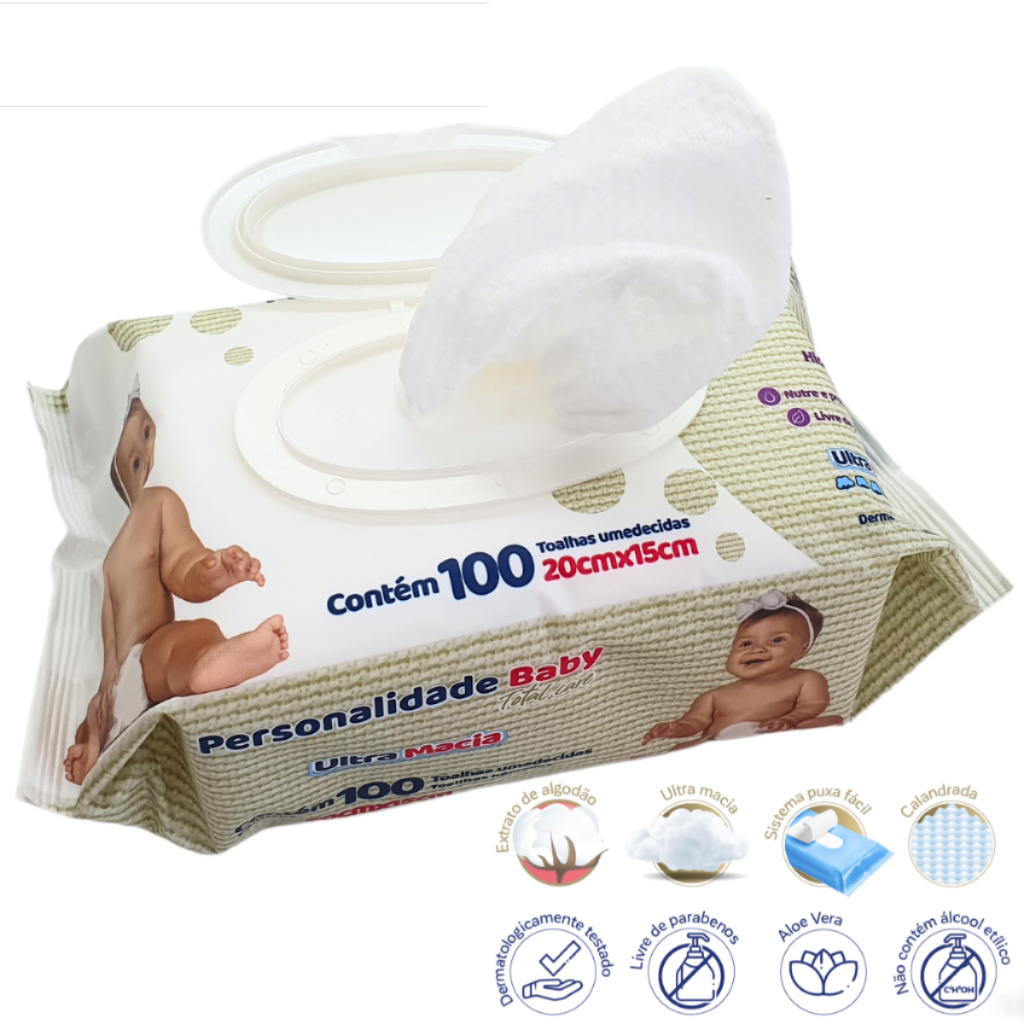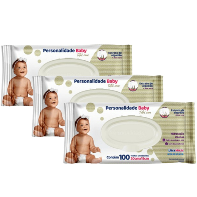 KIT DE 3 EMBALAGENS COM 100 UNIDADES CADA TOTALIZANDO 300 UNIDADES. LIVRE DE ÁLCOOL! A Toalha Umedecida Personalidade Baby Total Care é a escolha perfeita para os pais que desejam proporcionar o melhor cuidado e proteção para a pele delicada do seu bebê. Com uma fórmula enriquecida com extrato de algodão e Aloe vera, essas toalhas umedecidas oferecem hidratação intensa, nutrindo e protegendo a pele do seu pequeno com carinho e segurança. Livres de parabenos e dermatologicamente testadas, elas garantem uma limpeza suave e eficiente, enquanto sua textura ultra macia proporciona conforto e bem-estar em cada uso. Cuide do seu bebê com todo o amor que ele merece, com as Toalhas Umedecidas Personalidade Baby Total Care! Características e Benefícios: - Extrato de Algodão + Aloe vera As Toalhas Umedecidas Personalidade Baby Total Care contêm uma fórmula especial enriquecida com extrato de algodão e Aloe vera, que proporcionam uma limpeza delicada e suave, deixando a pele do bebê fresca e hidratada. - Hidratação Intensa: Graças à combinação única de extrato de algodão e Aloe vera, essas toalhas umedecidas oferecem uma hidratação intensa, ajudando a manter a pele do bebê sempre macia e saudável.
