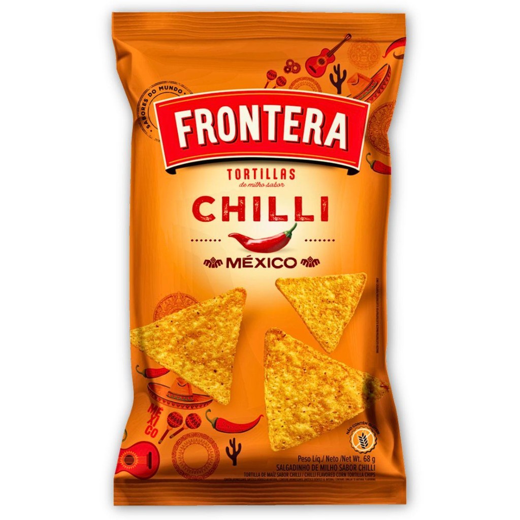 Kit com 3 sabores de salgadinhos Frontera: Salgadinho Tortilha de Milho Picante Forte Sriracha Frontera Tailândia Pacote 68g Salgadinho Tortilha de Milho Queijo Nacho Frontera México Pacote 68g Salgadinho Tortilha de Milho Chilli Frontera México Pacote 68g Ingredientes: Farinha de milho flocada, óleo vegetal e aromatizante. (Para o sabor de queijo, é adicionado condimento preparado sabor queijo e corante extrato de páprica)