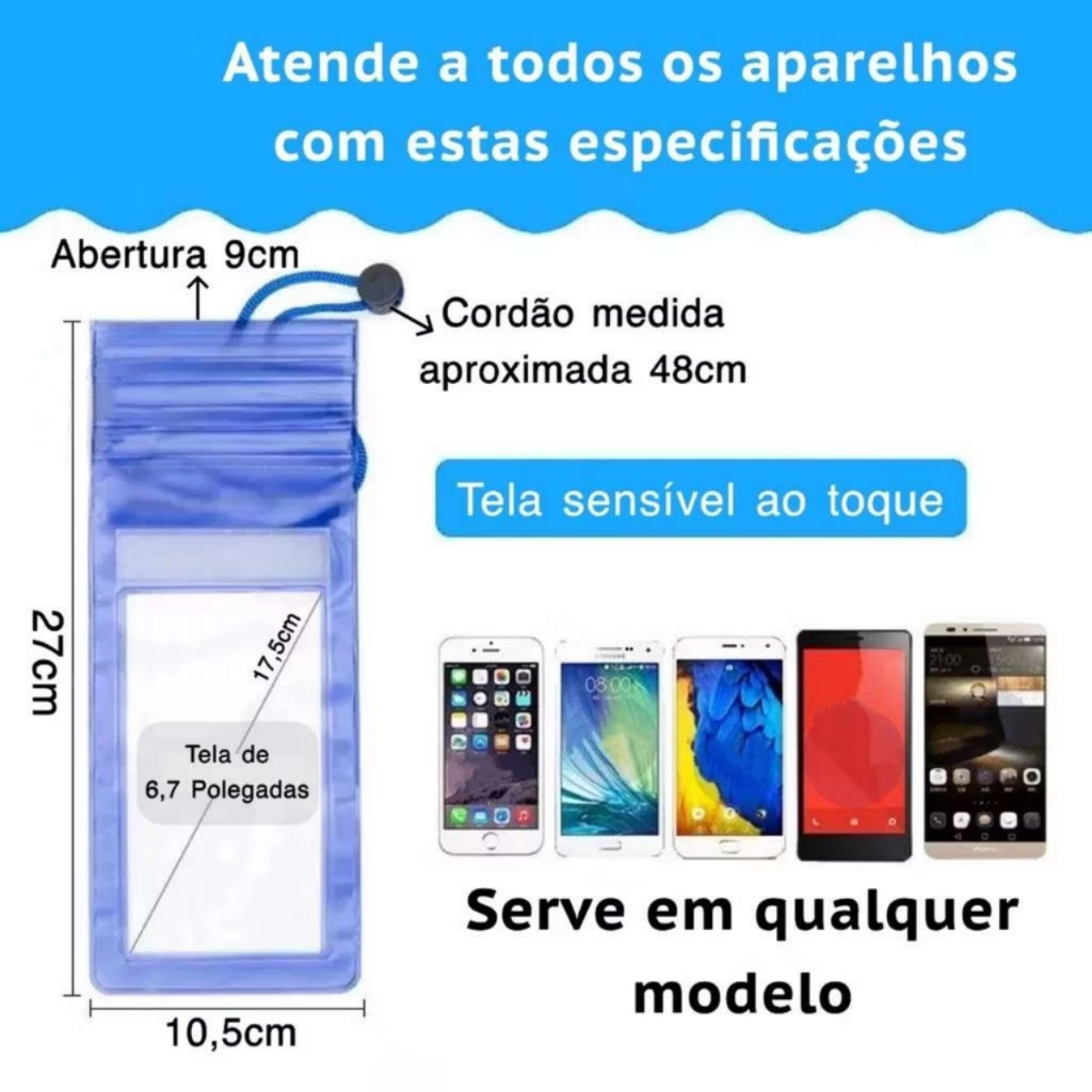 🎈IMPORTANTE: Antes de utilizar, faça um teste com um guardanapo seco, colocando-o na água para testar o produto, assim verificando se não tem nenhum problema com a capa protetora. Tire suas fotos embaixo dágua com total segurança e qualidade (a qualidade das fotos está diretamente ligada a qualidade de sua câmera, claridade em baixo dágua) - sugerimos não utilizar o flash da câmera para melhor nitidez das fotos. 🎈Características: .À prova de água até 10m de profundidade 🎈Medidas: C: 21.7x L: 11cm
