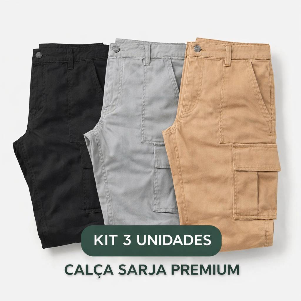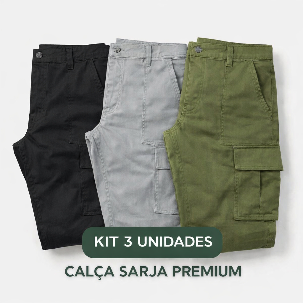 Kit 3 UN Calça Cargo Sarja Premiun Bolso Lateral Calça Sarja Embutido Confortável Qualidade e Estilo