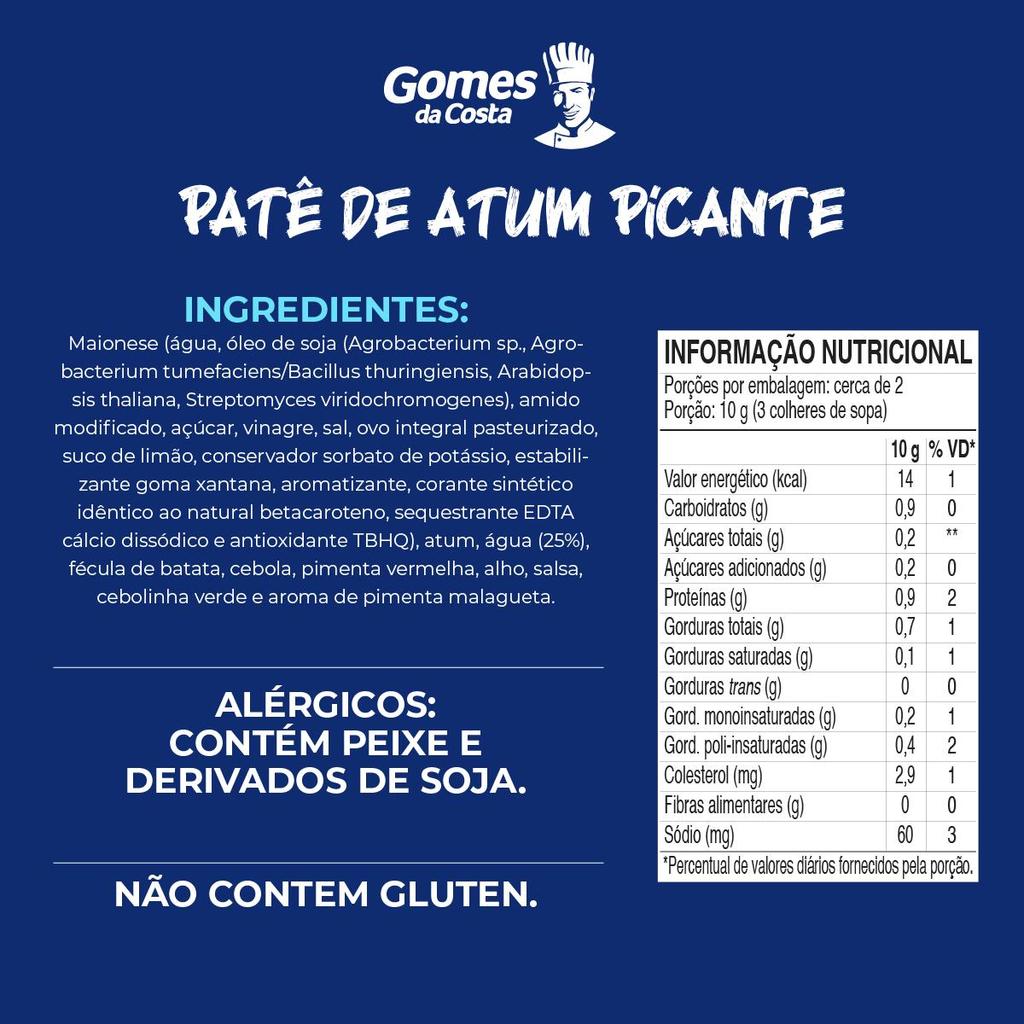 Os patês de atum Gomes da Costa são elaborados com a parte mais nobre e saborosa do peixe: o lombo. Pronto para servir, ele traz mais praticidade para o seu dia a dia, podendo ir direto para a mesa. Perfeitos para seus snacks da tarde, almoços corridos, intervalos de reuniões e encontros com os amigos. Obs.: Contém peixe, derivado de soja, pode conter ovo, pode conter pimenta