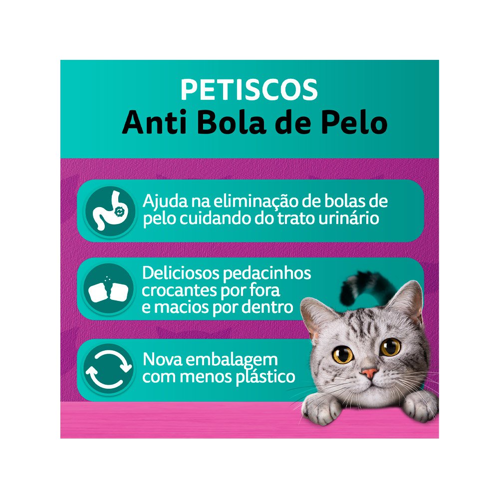 Petisco Whiskas Temptations Anti Bola De Pelo Gatos Adultos 80g - Indicado para gatos adultos;- Petisco crocante com delicioso recheio;- Com fibras que auxiliam na eliminação de bolas de pelo;- Demonstração de carinho com o seu gato; - Irresistível e saboroso. O Petisco Whiskas Temptations Anti Bola de Pelo Gatos Adultos é perfeito para todos os momentos do seu felino. Os petiscos são uma forma de demonstração de carinho, mas também podem ser usados como recompensa por bom comportamento. Esse Petisco da Whiskas vai auxiliar na eliminação de bolas de pelo do seu pet e cuidar do trato digestivo. A nova embalagem com menos plástico e sistema abre e fecha é perfeita também para guardar os petiscos por muito mais tempo. Quantidade Diária Ofereça ao seu gato no máximo 12 unidades por dia. Esse petisco não pode exceder 10% da necessidade diária de calorias do seu gato. Ajuste à quantidade diária de alimento completo e balanceado oferecido para seu gato e/ou para as atividades de seu gato. Ingredientes Milho Integral Moído, Glúten de Milho, Farinha de Vísceras de Aves, Quirera de Arroz, Gordura de Ruminantes, Farinha de Trigo, Farinha de Carne e Ossos de Bovino, Celulose, Gordura de Ave, Polpa de Beterraba, Glúten de Trigo, Hidrolisado de Fígado de Ave, Cloreto de Sódio (Sal Comum), B.H.T. (Hidróxido de Tolueno Butilado).