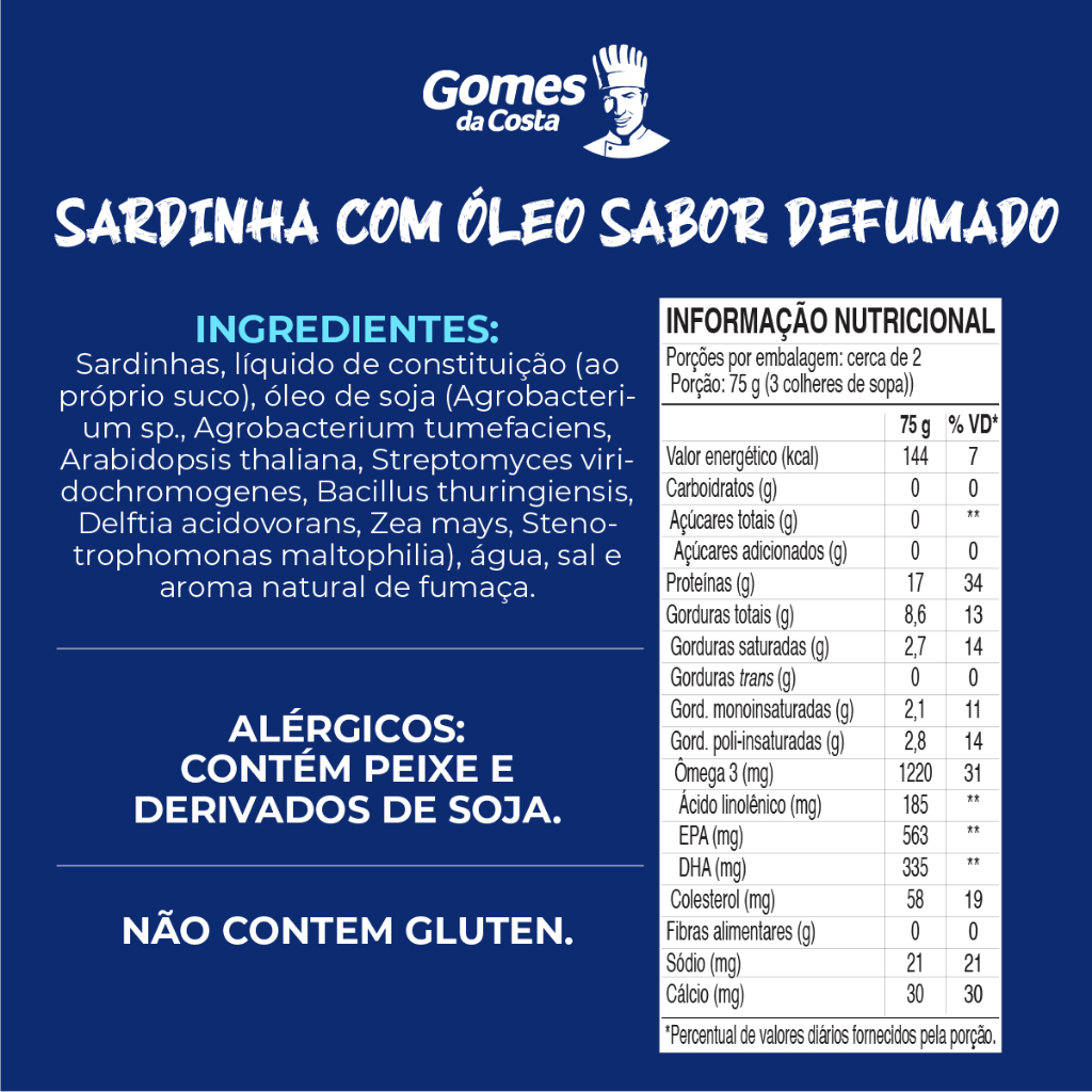 As Sardinhas Gomes da Costa são gostosas e práticas para o seu dia a dia. São deliciosas e nutritivas. Livres de conservantes, também são fonte de cálcio e protéinas, ótima opção para variar o cardápio. Elas possuem proteína, Cálcio e Ômega 3 de alta qualidade. As Sardinhas Tradicionais Gomes Da Costa estão disponíveis em 7 sabores para você diversificar e descomplicar suas receitas e paladares.