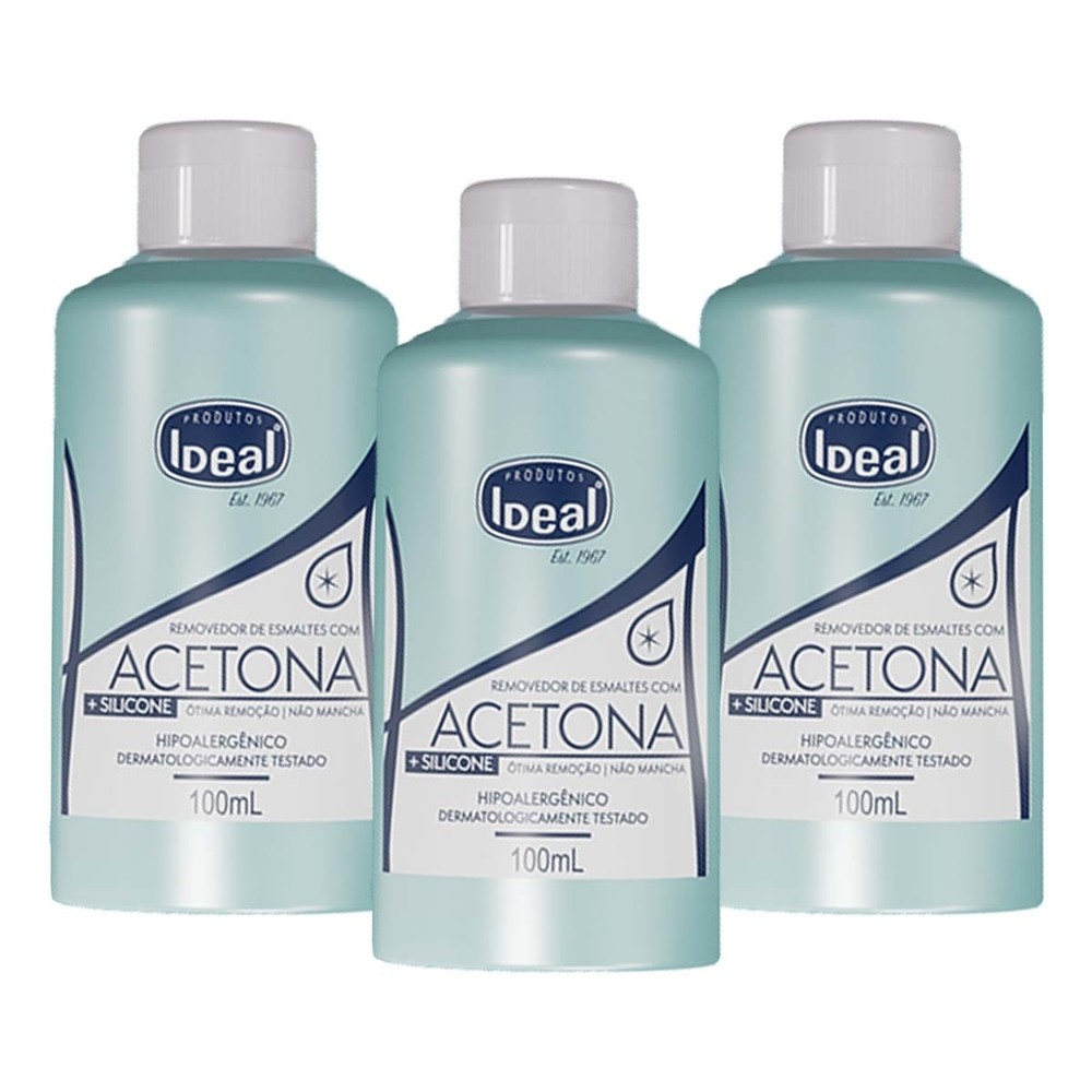 Kit 3 und Acetona Ideal 100ml REMOVEDOR DE ESMALTE IDEAL À BASE DE ACETONA 100ml Usada como solvente. A solução a base de acetona deve ser aplicada no local desejado até obtenção do resultado final. - Excelente remoção. - Não mancha. Modo de usar: Aplicar no local desejado com auxílio de algodão, até a completa remoção.