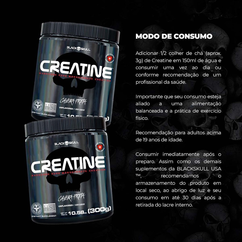 Creatine Blackskull 5,29Oz 300G Suplemento Alimentar Creatina em Pó sem Sabor Caveira Preta Black Skull Creatine Pote 300g Classificação Indicativa: A Partir de 19 Anos Ação Esperada do Medicamento: A creatina auxilia no aumento do desempenho físico durante exercícios repetidos de curta duração e alta intensidade. Modo de Preparo: Misture 1 dosador (3g) em 150ml de água, uma vez ao dia.