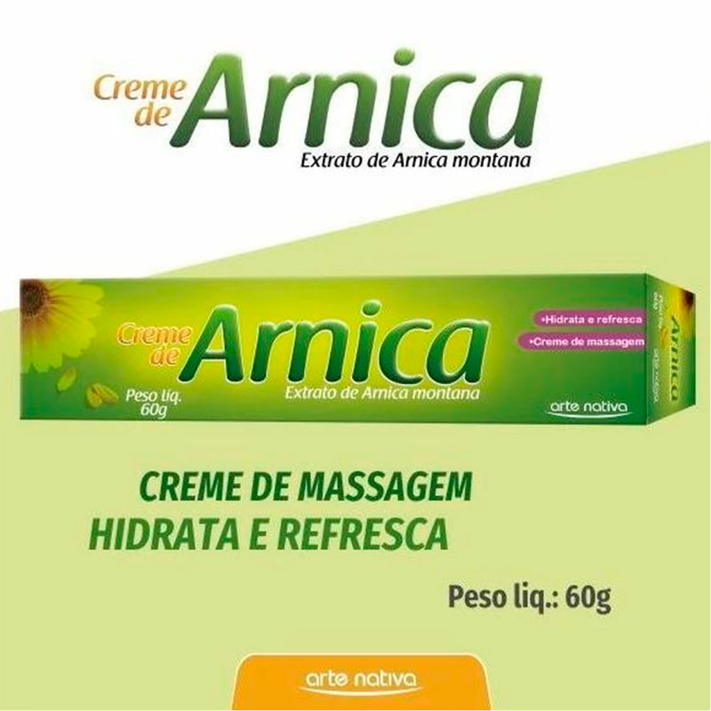 Kit 3 und Creme De Arnica Arte Nativa 60GFINALIDADE DE USO: Produto para o corpo. Creme massageador de arnica, pode ser utilizado em locais doloridos ou com hematomas, possui ótima textura e espalha facilmente, sendo rapidamente absorvido pela pele, hidratando-a e proporcionando uma sensação confortável e refrescante. Pode ser removido com água e não é gorduroso. Não aplicar em local com ferimento. APRESENTAÇÃO: Cartucho contendo bisnaga de alumínio de 60g