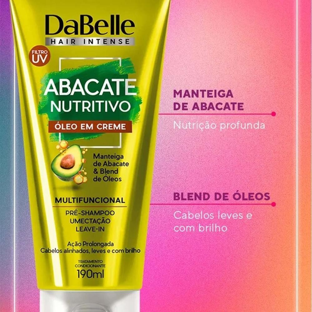 DaBelle Hair Abacate Nutritivo - Óleo em Creme 190ml O Óleo em Creme DaBelle Hair Abacate Nutritivo é perfeito para cabelos ressecados e sem brilho. Multifuncional, proporciona cabelos leves, alinhados e com brilho, além de contar com filtro UV. Contém Manteiga de Abacate, rica em Vitamina E, que repõe lipídios e combate o ressecamento. O blend de óleos (Argan, Abacate, Macadâmia, Girassol e Linhaça) protege, nutre com leveza, dá brilho e previne pontas duplas. Benefícios: Nutrição intensa, brilho, proteção UV, combate ao ressecamento, leveza e prevenção de pontas duplas. Modo de uso: Pré-shampoo: Umedeça os fios com água, aplique no comprimento e pontas, deixe agir por 5 minutos, enxágue e prossiga com sua rotina de lavagem e condicionamento. Umectação: Com os cabelos secos e sujos, aplique no comprimento e pontas, deixe agir por no mínimo 30 minutos ou durante a noite toda para uma ação mais potente. Lave e condicione em seguida. Creme de Pentear: Com os cabelos úmidos, aplique a quantidade certa nas mãos, espalhe nos cabelos e penteie como de costume. Resultado: Cabelos revitalizados, macios e cheios de vida.