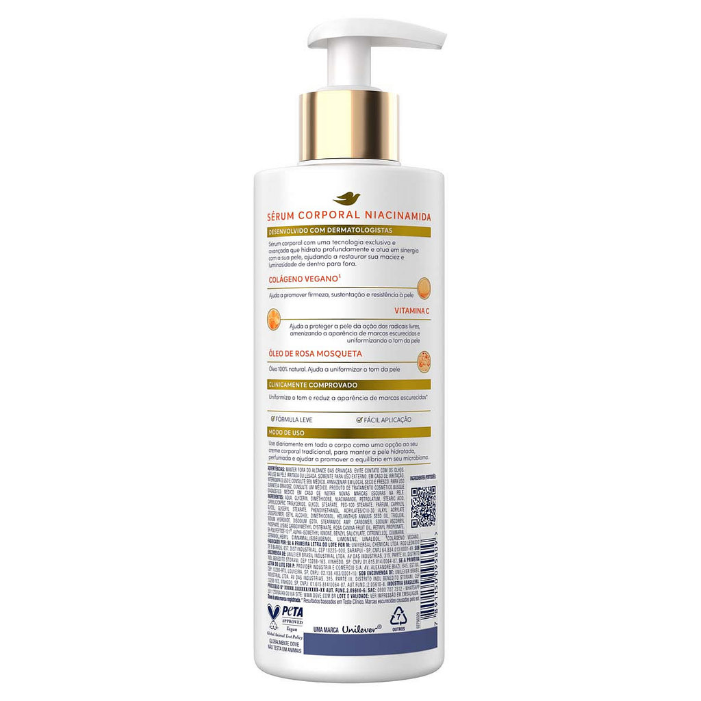Kit 3 Und Dove Sérum Corporal com Niacinamida 380ml O Sérum Corporal com Niacinamida Dove foi desenvolvido para quem deseja uma pele mais macia, radiante e com um tom uniforme. Com ativos faciais de alta potência e uma fórmula leve e eficaz, ele proporciona hidratação profunda por até 48 horas, ajudando a reduzir marcas escurecidas em apenas duas semanas. Benefícios do Sérum Corporal com Niacinamida Dove: Hidratação intensa por até 48 horas: Proporciona uma pele macia e iluminada Ativos faciais de alta potência: Contém niacinamida para uniformizar o tom da pele, colágeno vegano para hidratação e vitamina C para luminosidade Clinicamente comprovado: Reduz marcas escurecidas em duas semanas, ajudando na autorreparação da pele Fórmula leve e não oleosa: Absorção rápida para um uso confortável no dia a dia PETA-Approved Vegan: Produto vegano e não testado em animais Perfeito Para: Uniformizar o tom da pele: A niacinamida age diretamente nas áreas com marcas escurecidas, proporcionando um tom mais uniforme Hidratar profundamente: Com uma fórmula que fortalece e hidrata a pele, garantindo uma textura macia e radiante Cuidar da pele diariamente: Uma alternativa perfeita às loções hidratantes tradicionais, indicada para todos os tipos de pele, inclusive sensíveis Como Usar: Aplique o sérum no corpo todo em movimentos circulares, prestando atenção às áreas com marcas escurecidas ou que precisam de hidratação extra. Use diariamente para garantir uma pele hidratada e com um tom uniforme. Sua fórmula leve é absorvida rapidamente, proporcionando um cuidado prático e eficaz. Experimente o Sérum Corporal com Niacinamida Dove e descubra o poder da hidratação para uma pele macia, radiante e com um tom uniforme!