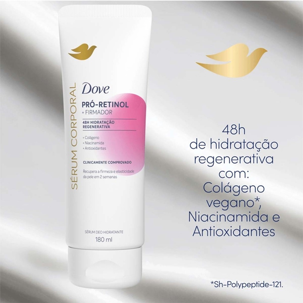 Kit 3 und Dove Serum Corporal Pro Retinol 180ml Descubra o Sérum Corporal Pró-Retinol Dove, seu aliado para uma pele mais firme, elástica e radiante. Este sérum corporal hidratante proporciona até 48 horas de hidratação regenerativa, melhorando visivelmente a firmeza e a elasticidade da pele em apenas duas semanas. Desenvolvido com dermatologistas, ele conta com ativos faciais de alta potência, como o pró-retinol, colágeno vegano e niacinamida, para ajudar na autorreparação da pele e promover um brilho saudável. Benefícios: Hidratação profunda por até 48 horas Melhora visivelmente a firmeza e elasticidade da pele Contém pró-retinol, colágeno vegano e niacinamida Ação clinicamente comprovada em duas semanas Textura leve e de rápida absorção PETA-Approved Vegan Indicação: Ideal para todos os tipos de pele, especialmente para quem busca hidratação profunda, firmeza e elasticidade. Modo de Uso: Aplique o Sérum Corporal Pró-Retinol Dove diariamente em movimentos circulares por todo o corpo. A fórmula leve e não oleosa é rapidamente absorvida, deixando sua pele macia e radiante ao longo do dia. Dica Extra: Conheça também outros produtos da linha Dove, como o Sérum Corporal Dove com Pantenol para pele sensível e o Sérum Corporal Pró-Ceramidas para pele extra seca.