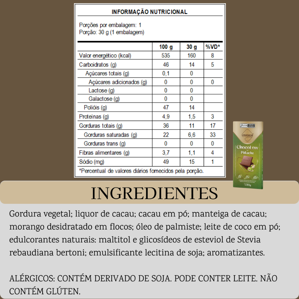 **Não é Recheado** O Chocolate com Pistache Lowçucar 30g é uma escolha deliciosa e saudável para quem busca manter uma dieta equilibrada e controlada em açúcares, Com zero adição de açúcares e lactose, este chocolate é perfeito para pessoas que buscam opções que respeitem suas restrições alimentares sem abrir mão do sabor. O pistache triturado confere um toque especial, criando uma experiência sensorial que combina perfeitamente com o sabor rico do cacau. Além disso, este produto é livre de glúten, o que o torna uma ótima escolha para celíacos ou quem evita essa proteína. Benefícios Principais: ✓ Zero adição de açúcares ✓ Zero lactose ✓ Não contém glúten ✓ Rica em fibras ✓ Zero adição de açúcares: Adequado para quem segue dietas de controle glicêmico. ✓ Zero lactose: Ideal para intolerantes à lactose. ✓ Não contém glúten: Sendo uma opção segura para celíacos. ✓ Rica em fibras alimentares: Ajuda na digestão. ✓ Um toque de pistache: Proporcionando sabor e textura únicos. Sua fórmula cuidadosamente desenvolvida inclui ingredientes como gordura vegetal, liquor de cacau e manteiga de cacau, combinados com o edulcorante natural maltitol e glicosídeos de esteviol. Isso garante que, mesmo sem açúcar, o sabor seja agradável e indulgente. Perfeito para saciar aquela vontade de comer chocolate durante o dia sem culpa. INFORMAÇÃO NUTRICIONAL: Porções por embalagem: 1 Porção: 30 g (1 unidade) Valor energético: 160 kcal (8% VD) Carboidratos: 14g (5% VD) Açúcares totais: 0g Açúcares adicionados: 0g (0% VD) Lactose: 0g Galactose: 0g Polióis: 14g Proteínas: 1,5g (3% VD) Gorduras totais: 11g (17% VD) Gorduras saturadas: 6,6g (33% VD) Gorduras trans: 0g (0% VD) Fibras alimentares: 1,1g (4% VD) Sódio: 15mg (1% VD) *Percentual de valores diários fornecidos pela porção. Se você está buscando uma maneira de se deliciar sem comprometer sua saúde, o Chocolate com Pistache Lowçucar 30g é a escolha certa para você!