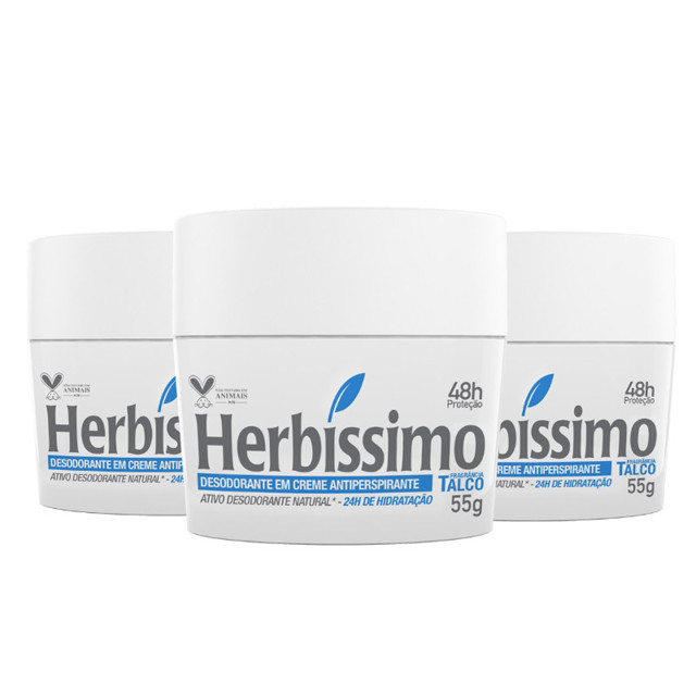 | Kit 3 unid - Desodorante Creme Antitranspirante Talco Herbíssimo 55G este produto | R$ 32,65 | 32% | 5.0/5 | — |