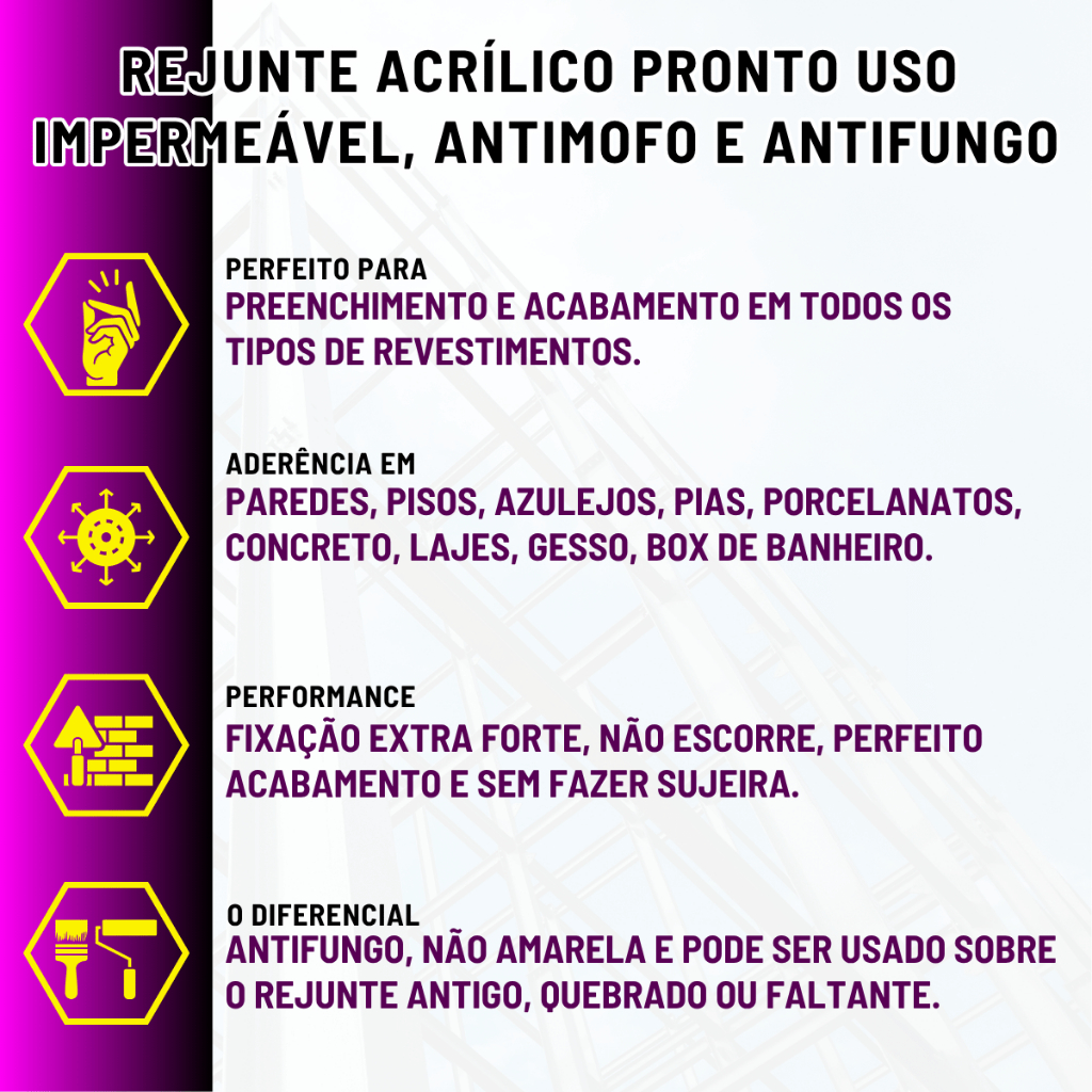Uma solução essencial para sempre se ter em casa! o REJUNTE ACRÍLICO IMPERMEÁVEL da VTEX é uma massa de rejuntamento pronto uso, fácil aplicação, não escorre durante a aplicação, tem agarre imediato, secagem rápida e extra forte. Indicado para uso em ambientes internos e externos, é ideal para rejuntar locais como box de banheiro, pias, azulejos e pisos diversos. Impermeável e Antifungo, pode ser aplicado em locais onde o uso de água é frequente. Não amarela com o tempo e seca ao toque em 4 horas e total 24 horas. Por ser base d’água, não possui cheiro forte. Um diferencial do REJUNTE VTEX é que pode ser aplicado sobre o rejunte antigo, quebrado ou faltante. É só abrir, aplicar, retirar o excesso e pronto! REJUNTE VTEX aceita todos os tipos de tintas. ** INSTRUÇÕES DE USO COMPLETO NAS FOTOS ** PRODUTO: VTEX REJUNTE - REJUNTE ACRÍLICO PRONTO USO IMPERMEÁVEL E ANTI-FUNGO TEXTURA DO PRODUTO NA EMBALAGEM: Massa Pastosa TEXTURA DO PRODUTO DEPOIS DE SECO: Rígida CORES: Branco | Cinza | Preto | Palha (verificar a disponibilidade de estoque no ato da compra) TEMPERATURA QUENTE: Suporta até 80°C TEMPERATURA FRIA: Suporta até -5°C SECAGEM PARCIAL: 6 horas (podendo aplicar uma segunda demão) SECAGEM TOTAL: 24 horas (podendo ser molhado, lixado e pintado) IMPERMEÁVEL, ANTI-FUNGO / ANTI-MOFO RENDIMENTO MÉDIO APROXIMADO EM M² (metros quadrados) e METROS LINEARES NAS FOTOS DO ANÚNCIO USO PRETENDIDO: Preenchimento de frestas, buracos e vãos em revestimentos novos e também aplicação sobre rejunte antigo, rejunte quebrado ou rejunte faltante. INDICADO PARA REJUNTAMENTO EM: REVESTIMENTOS COMO: PISOS–AZULEJOS–PORCELANAS–PORCELANATOS–BLOCOS–TIJOLOS–PAREDES–PISOS–PIAS–BOX DE BANHEIRO–APLICAÇÃO DE REJUNTE SOBRE REJUNTE **IMPORTANTE** - RETIRAR O EXCESSO DE REJUNTE LOGO APÓS A APLICAÇÃO. DEPOIS DE SECO A RETIRADA DO EXCESSO SE TORNA EXTREMAMENTE DIFICIL DEVIDO AO ALTO PODER DE FIXAÇÃO! VANTAGENS GERAIS: Suporta até 80°C | Produto 100% Nacional |Pronto para uso | Cores Diversas| Base D'água | Sem cheiro | Não resseca | Não descola | Fácil aplicação |Ultra Aderência | Área Interna e Externa | Perfeito acabamento | Alta Resistência e Durabilidade | Antifungo e Antimofo | Agarre imediato | A cor branca não amarela com o tempo | Pode ser aplicado sobre rejunte antigo, quebrado ou faltante. PREPARAÇÃO DA SUPERFÍCIE: Deixar a superfície totalmente seca, limpa e livre de óleo e pó e partículas soltas. COMO UTILIZAR: Realizar a aplicação preenchendo toda a área de aplicação. Espalhar o produto com o dedo (utilize uma luva de látex) ou pazinha, espátula metálica ou de silicone afim de preencher 100% da superfície sem deixar espaços vazios. RETIRAR O EXCESSO LOGO APÓS A APLICAÇÃO com uma espátula ou um pano levemente umedecido. Caso haja retração do produto, aplique uma segunda camada após 6 horas. Após aberto, fechar corretamente para evitar ressecamento do produto dentro da embalagem. ORIENTAÇÕES ADICIONAIS: 1) Produto PRONTO USO – NUNCA DILUIR com água ou outro componente. A diluição muda toda a estrutura molecular do produto perdendo a sua adesividade. 2) Não aplicar em locais molhados, sob umidade ou em dias de chuva. 3) NÃO MOLHAR, TAPAR COBRIR OU ABAFAR o local após realizar a aplicação até a cura total do produto 4) Não seguir tais instruções poderá comprometer o resultado final na aderência do produto. 5) O produto em contato com a pele pode causar ressecamento. Lave com sabão ou sabonete neutro em água corrente. Deixar fora do alcance de crianças e animais. 6) Guardar e armazenar em local seco e arejado. - A PLATAFORMA NÃO PERMITE realizar nenhum tipo de alteração, observação ou atualização do seu cadastro. - A RESPONSABILIDADE DE ENTREGA É 100% DA PLATAFORMA. Não temos interferência em prazos de entrega. A data prevista de entrega aparece em seu painel, dentro do campo de COMPRAS, por isso, se atente a DATA PREVISTA DE ENTREGA que é informada no ato sua compra. - O PRODUTO ACOMPANHA NOTA FISCAL ELETRÔNICA? Sim! Todos os produtos acompanham junto a Nota Fiscal. - DATA DE VALIDADE DOS PRODUTOS: 3 anos de Validade após a data de fabricação. - QUANTO TEMPO LEVA PARA DESPACHAR MINHA COMPRA? Pedidos com pagamentos confirmados até as 11h00 são despachados no mesmo dia. Após as 11h00 o pedido será despachado no próximo dia útil. - POSSUI PRONTA ENTREGA, ESTOQUE? Sim! Todos os nossos produtos possuem pronta entrega em alto volume de estoque. - RECLAMAÇÕES/PROBLEMAS COM A COMPRA: Caso receba o produto com algum problema, pedimos que antes de abrir uma reclamação na plataforma, entre em contato com a nossa equipe através do chat ou telefone disponível nos rótulos de cada produto, para que um de nossos atendentes possa tomar as devidas providências e resolver o problema mais rapidamente. Reclamações abertas dentro da plataforma leva em média 15 dias úteis.